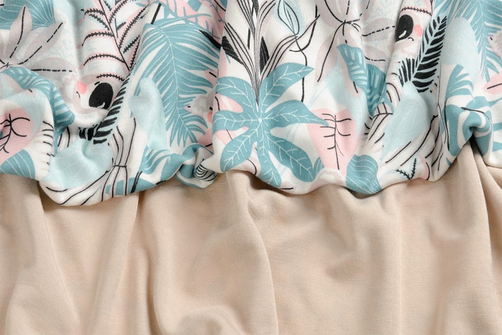 Naturalny, miękki, dwustronny Kocyk dziecięcy BAMBOO, roz.75x100cm materiał: JERSEY 100% bamboo + JERSEY 100% bawełna drukowana obszyty lamówką - dżungla + beż