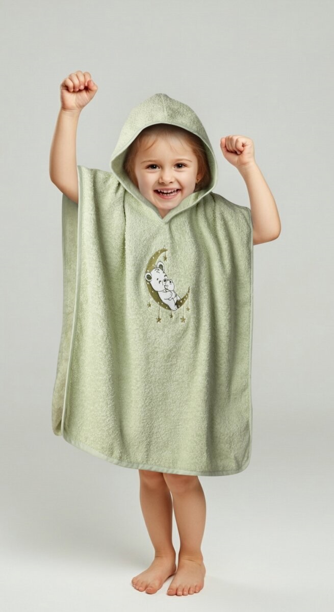 Miękkie, otulające i wyjątkowo praktyczne – ponczo dziecięce z kapturem Baby w kolorze miętowym to idealne rozwiązanie po kąpieli, na plażę, basen czy wakacyjny wyjazd. Duży rozmiar oraz wygodny kaptur skutecznie chronią dziecko przed chłodem i pomagają szybko osuszyć ciało oraz włosy.