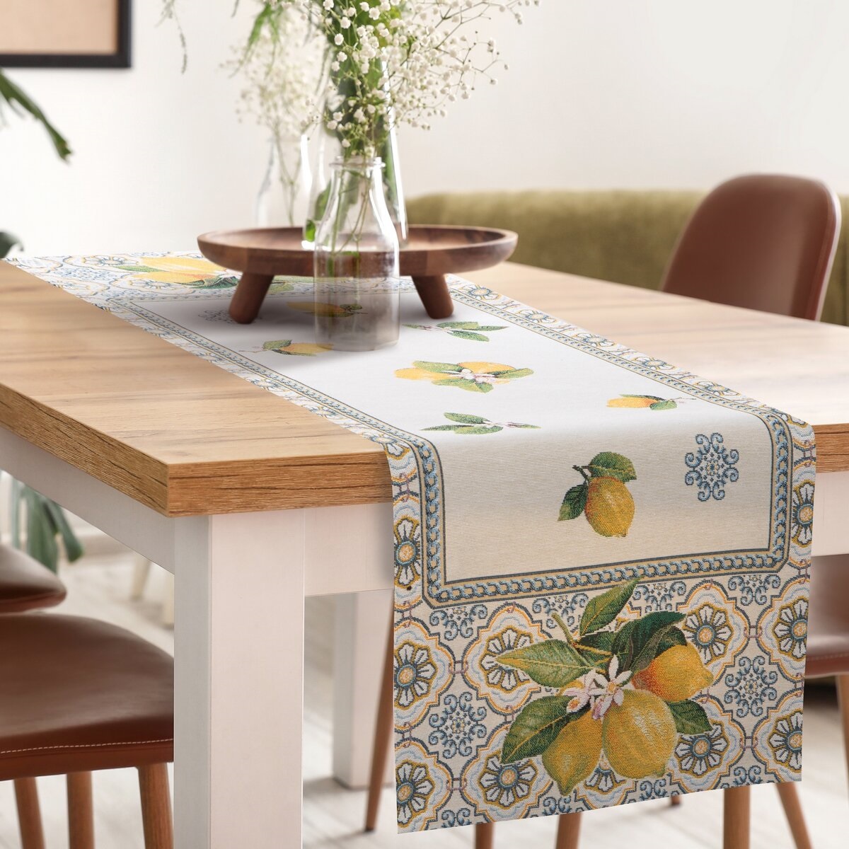 Stylowy bieżnik gobelinowy z motywem kwiatowym - cytryny to elegancka dekoracja stołu, która doskonale podkreśli wiosenny i świąteczny charakter wnętrza. Bogaty, roślinny wzór wprowadza świeżość oraz naturalny akcent do aranżacji jadalni, salonu lub kuchni. Bieżnik świetnie sprawdzi się zarówno podczas uroczystych spotkań rodzinnych, jak i w codziennym wystroju.