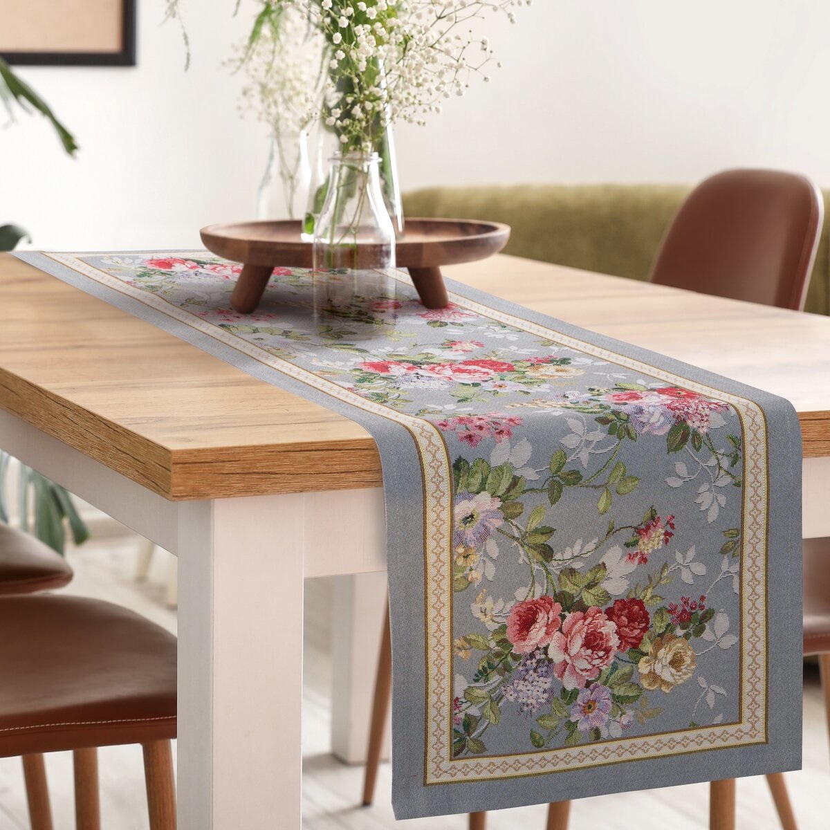 Stylowy bieżnik gobelinowy z motywem kwiatowym to elegancka dekoracja stołu, która doskonale podkreśli wiosenny i świąteczny charakter wnętrza. Bogaty, roślinny wzór wprowadza świeżość oraz naturalny akcent do aranżacji jadalni, salonu lub kuchni. Bieżnik świetnie sprawdzi się zarówno podczas uroczystych spotkań rodzinnych, jak i w codziennym wystroju.
