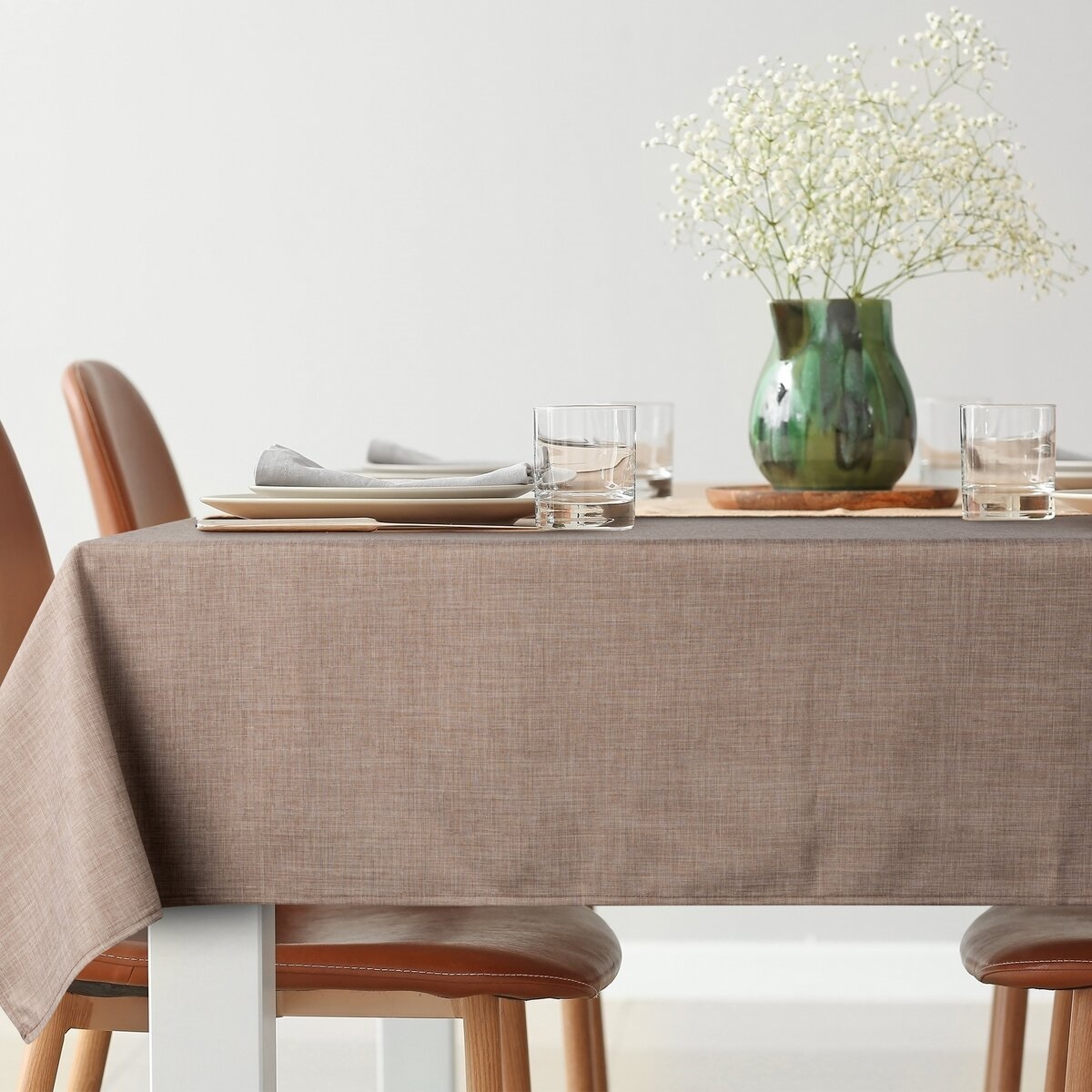 Bieżnik wykonano w 100% z poliestru o gramaturze 170 g/m², co zapewnia trwałość, estetyczny wygląd oraz łatwą pielęgnację. Wodoodporna tkanina chroni powierzchnię stołu przed wilgocią i zabrudzeniami, zachowując elegancki wygląd nawet przy codziennym użytkowaniu.
