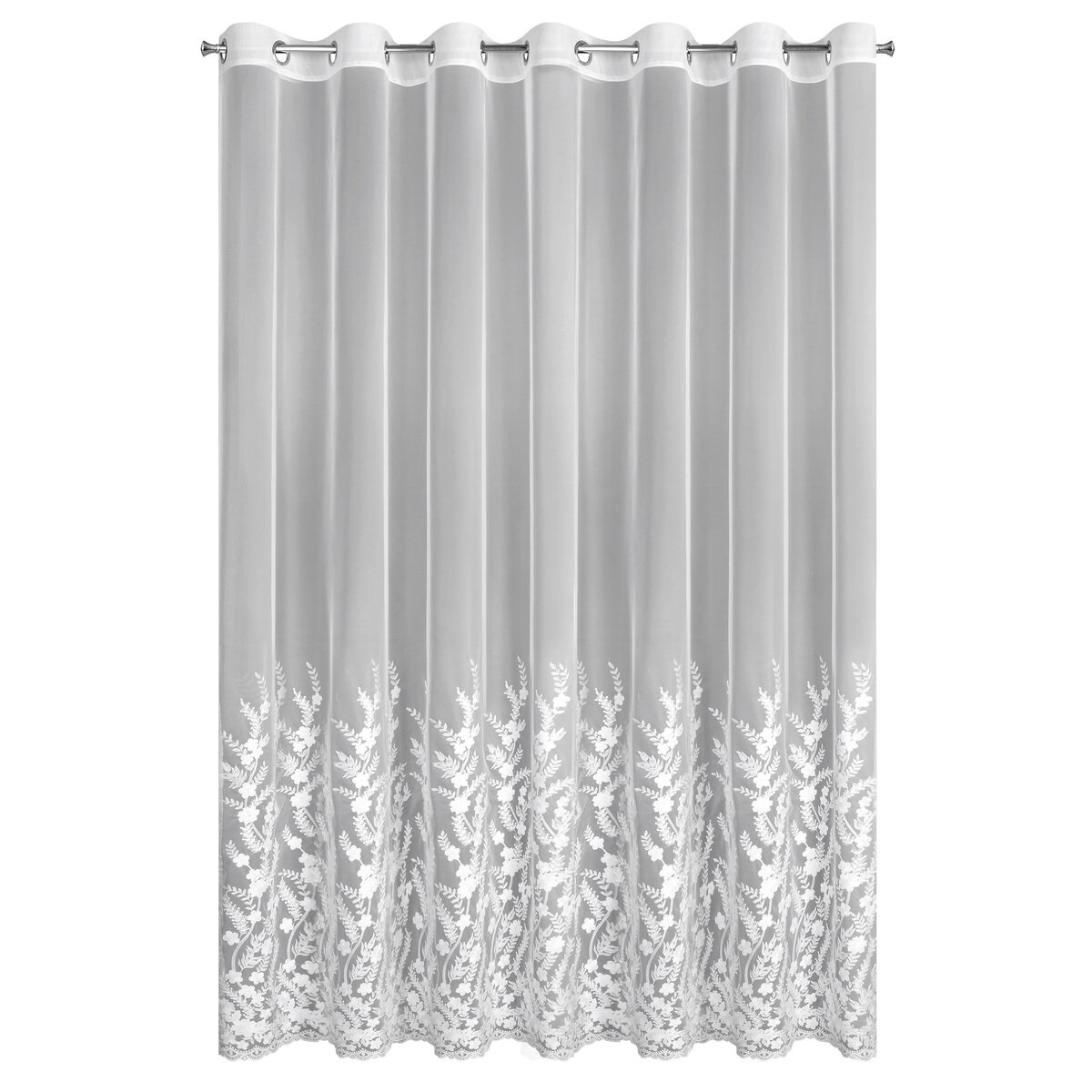 Dekoracyjny haftowany wzór dodaje firanie klasy i ponadczasowej elegancji. Praktyczny sposób zawieszenia na przelotkach (kołach) zapewnia szybki montaż oraz estetyczne, równomierne układanie się tkaniny na karniszu. Biały kolor sprawia, że firana doskonale pasuje zarówno do nowoczesnych, jak i klasycznych aranżacji.
