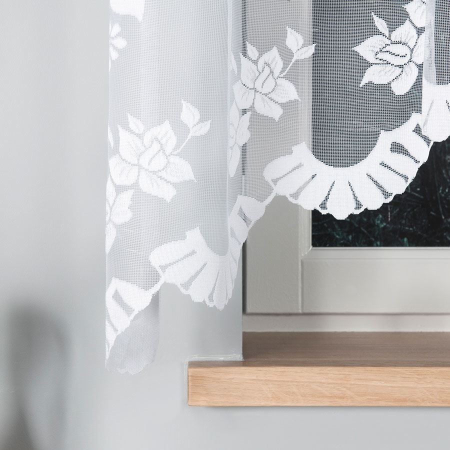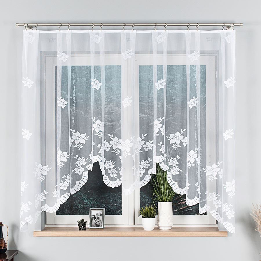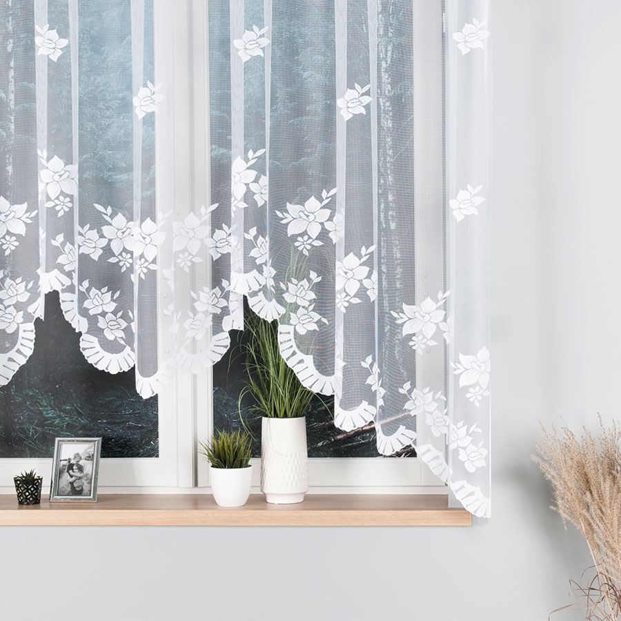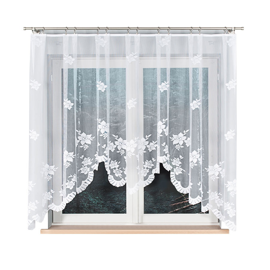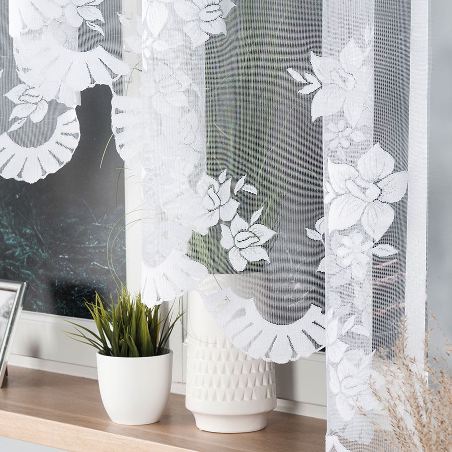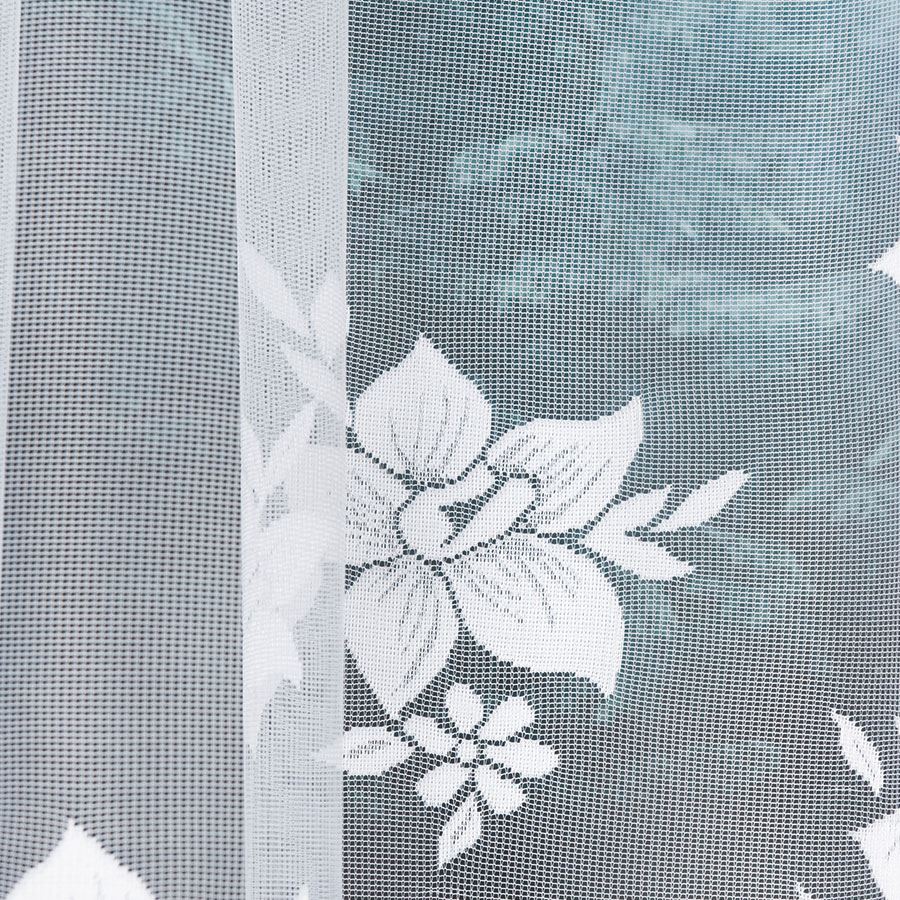 Firanka została wykonana z trwałej tkaniny żakardowej (kod podkładu 000 – żakard), która wyróżnia się: