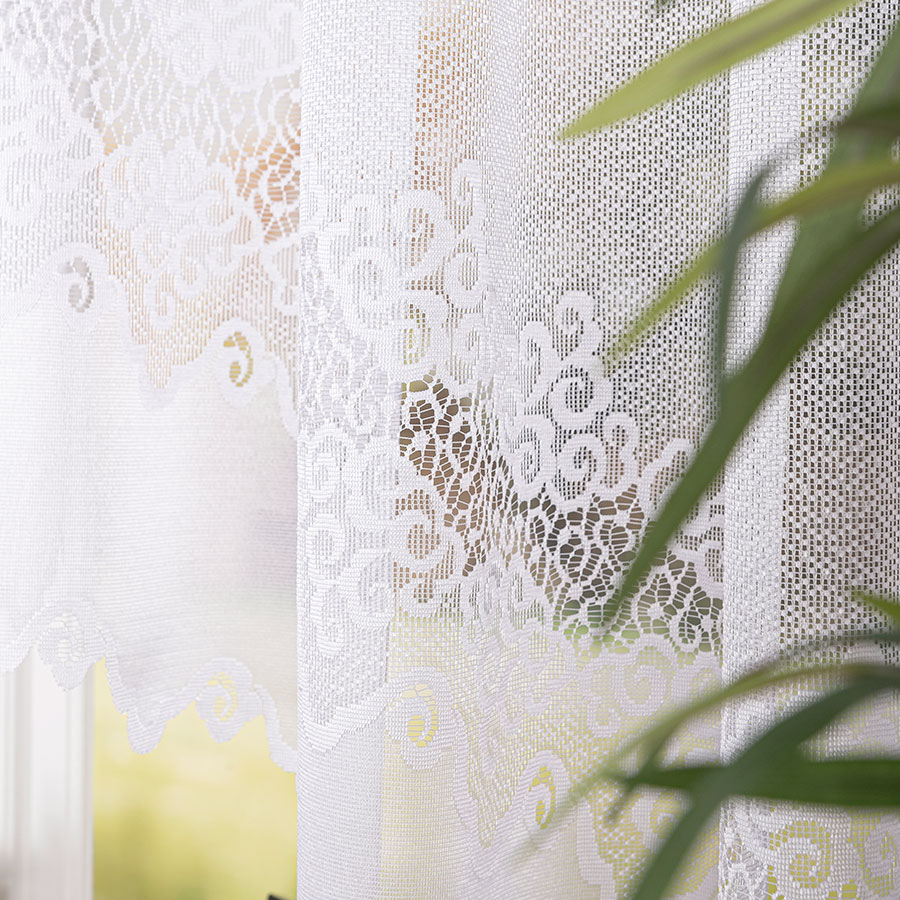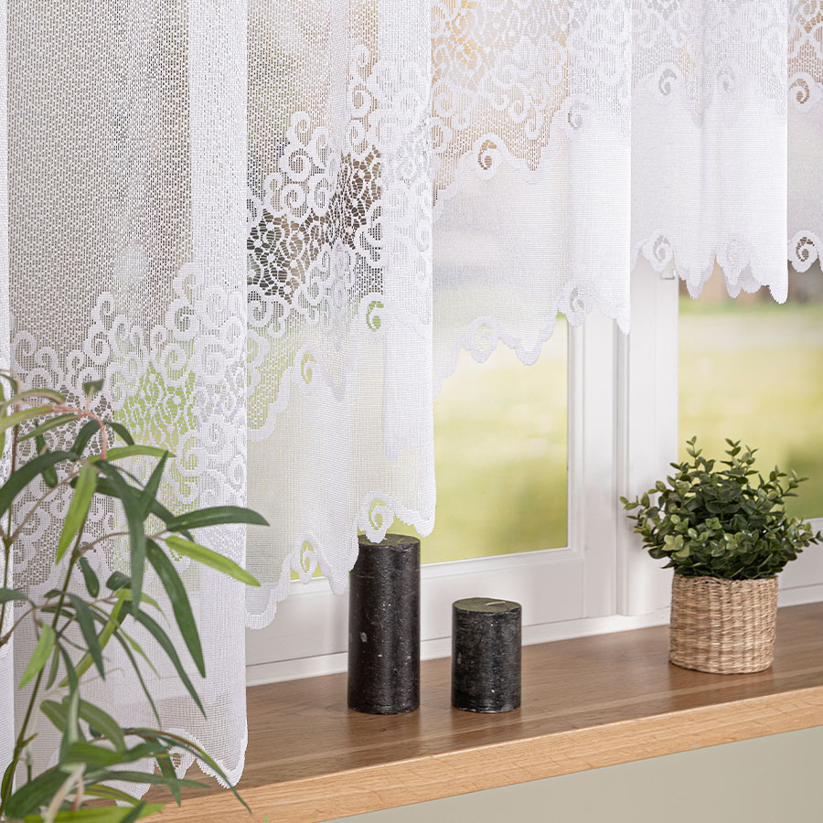 Model wykonany jest z wysokiej jakości tkaniny poliestrowej, dzięki czemu firanka jest trwała, odporna na zagniecenia i bardzo łatwa w pielęgnacji. Gotowa forma pozwala na szybkie zawieszenie na karniszu bez konieczności szycia czy dodatkowych przeróbek. Wysokość 160 cm sprawia, że firanka świetnie pasuje do standardowych okien, szczególnie w kuchni lub pomieszczeniach, gdzie preferowane są krótsze dekoracje okienne.
