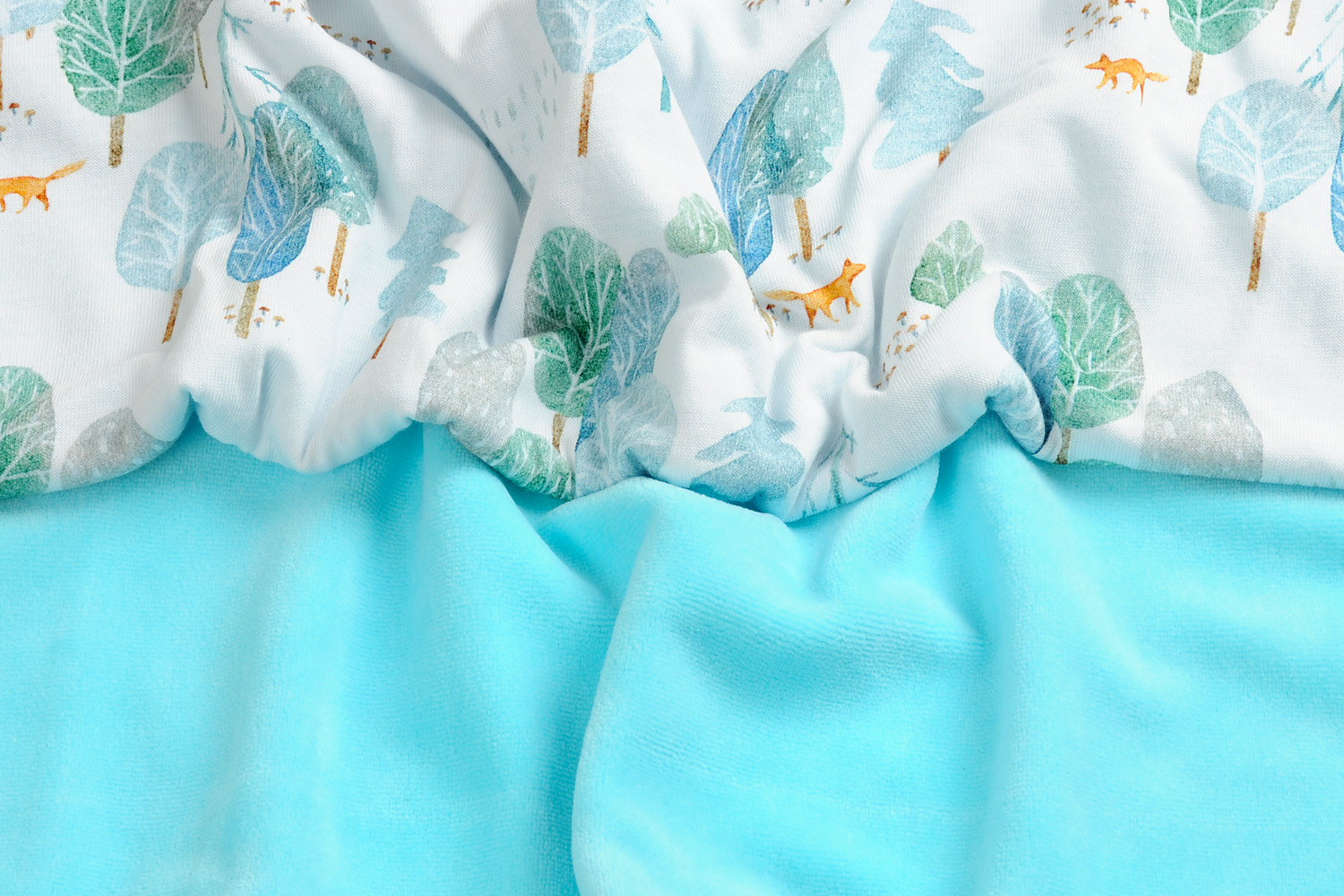 Kocyk VELLO roz. 75x100 cm. tkanina druk+ welur jednobarwny WZÓR welur turkusowy