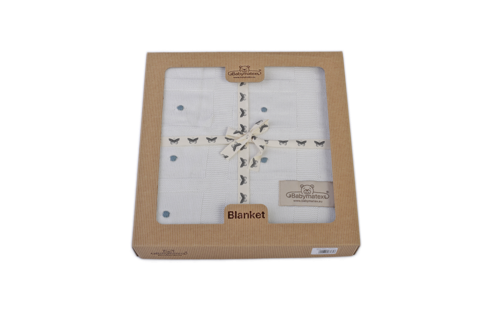 Ekologiczne Opakowanie: Produkt jest starannie zapakowany w schludne kartonowe opakowanie, które jest w pełni ekologiczne. Dzięki temu zapakowany kocyk może być doskonałym prezentem na baby shower lub inną okazję.