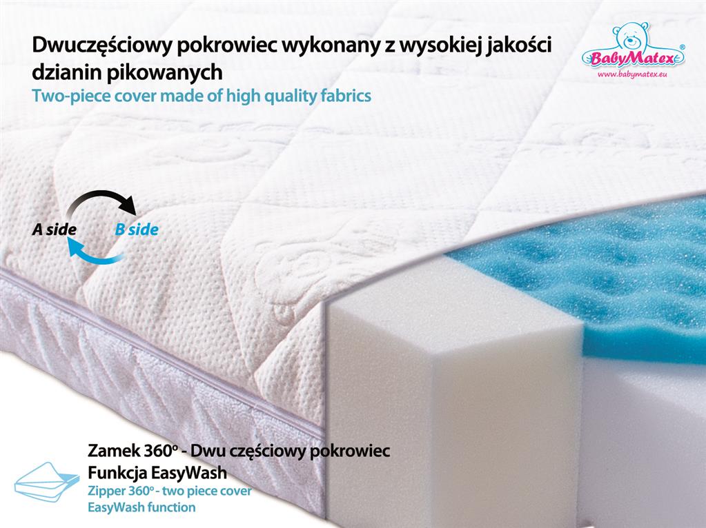Pikowany, Dwustronny Pokrowiec: Pokrowiec materaca został zaprojektowany tak, aby zapewnić maksymalny komfort i bezpieczeństwo. Jego dwustronny, rozdzielczy zamek 360° pozwala na łatwe pranie i użytkowanie jednej strony podczas prania drugiej. Wykonany z trójwarstwowej, puszystej dzianiny żakardowej z logo BabyMatex® oraz dzianiny frotte o właściwościach chłonnych, pokrowiec zapewnia przyjemne i higieniczne warunki snu.
