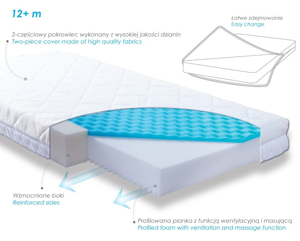 Innowacyjne Wypełnienie: Wypełnienie materaca składa się z pianki poliuretanowej o wysokiej gęstości, która dostosowuje się do ciała dziecka, zapewniając odpowiednie podparcie dla kręgosłupa. Wertykalne kanaliki wentylacyjne na stronie dla niemowląt oraz modulacje o zwiększonej gęstości i funkcji masażu zapewniają optymalną cyrkulację powietrza i komfort snu.