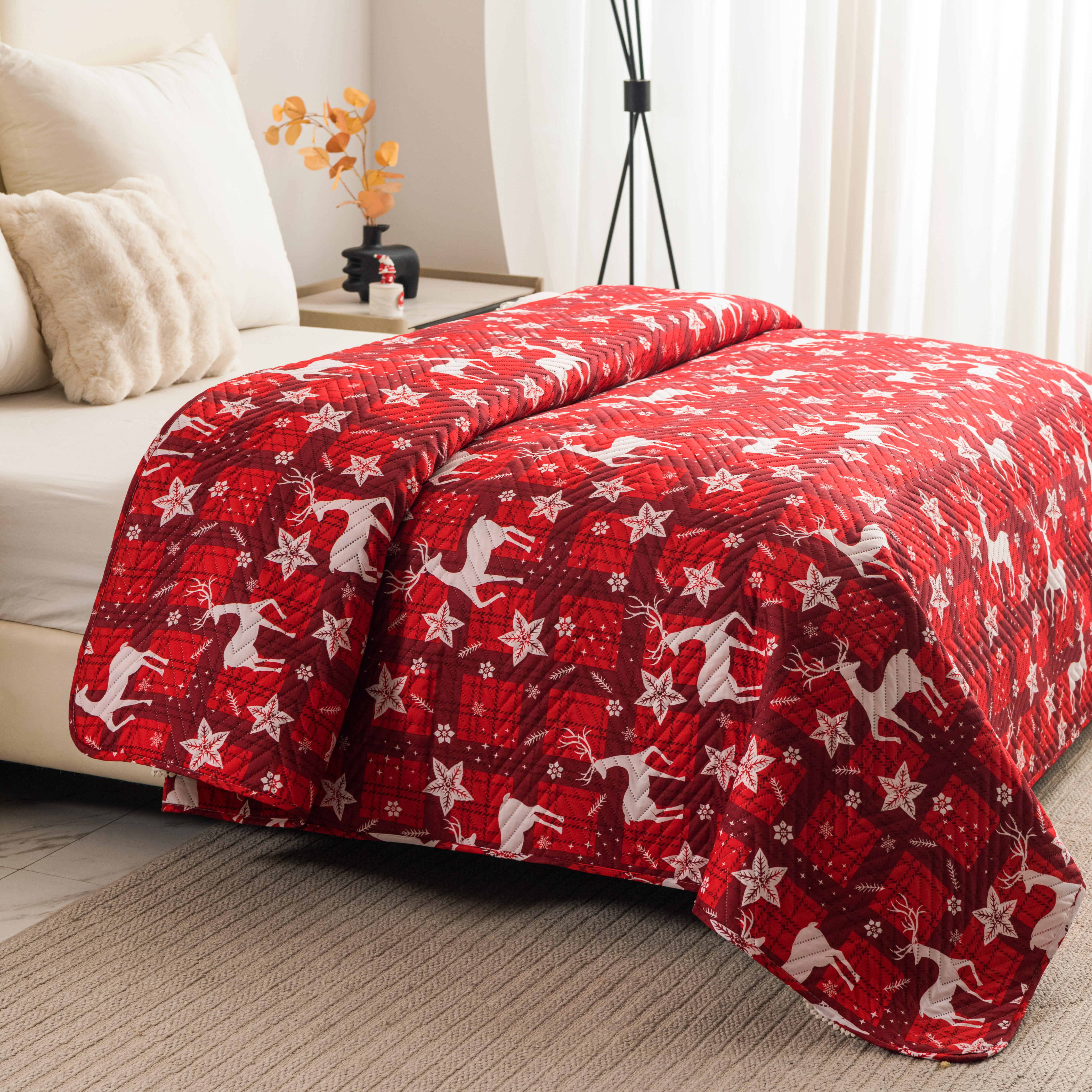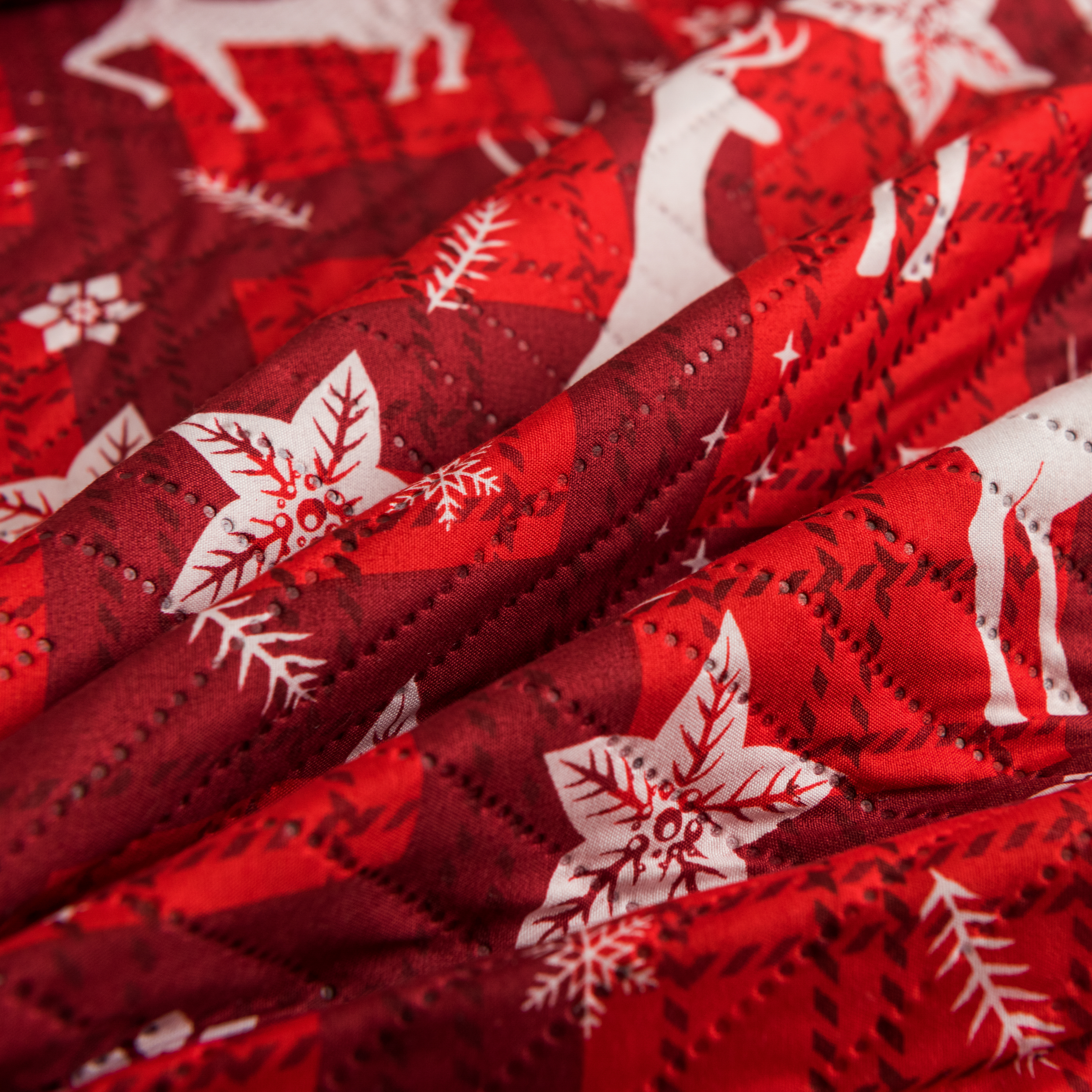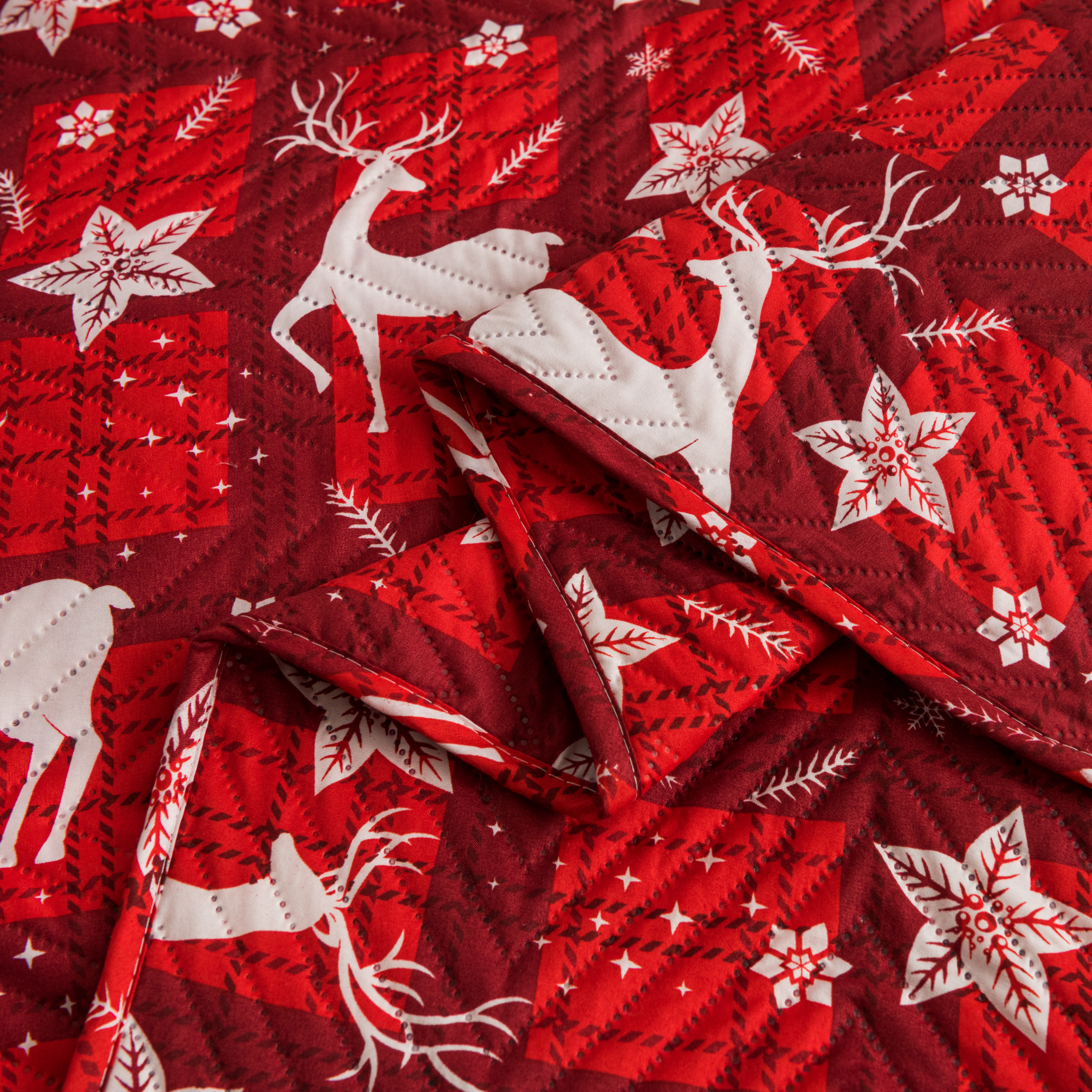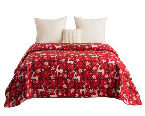 Wprowadź do swojego wnętrza magię świąt dzięki wyjątkowej narzucie w bożonarodzeniowym stylu! Pikowana narzuta w intensywnej czerwieni z uroczymi reniferami, gwiazdkami i napisem Merry Christmas to idealny sposób na stworzenie ciepłej, rodzinnej atmosfery w salonie lub sypialni.