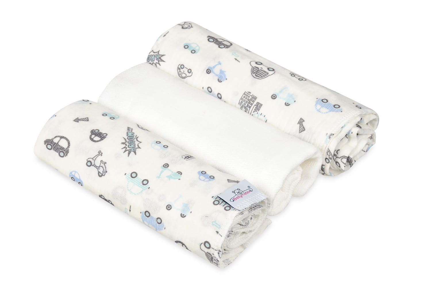 Pielucha MUSLIN DESIGN 3 pak100% bawełna, roz. 70x80 2szt + 1 szt tetrowa, muślina, autka