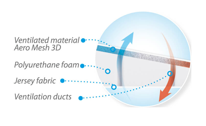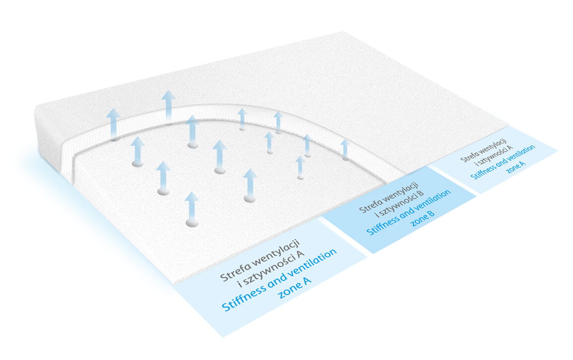 Wypełnienie poduszki stanowi pianka poliuretanowa, która zapewnia prawidłowe ułożenie główki dziecka, wspierając zdrowy rozwój kręgosłupa. Wentylacyjny system otworów umożliwia swobodny przepływ powietrza, co dodatkowo zwiększa komfort snu dziecka oraz zapewnia odpowiednią wentylację.