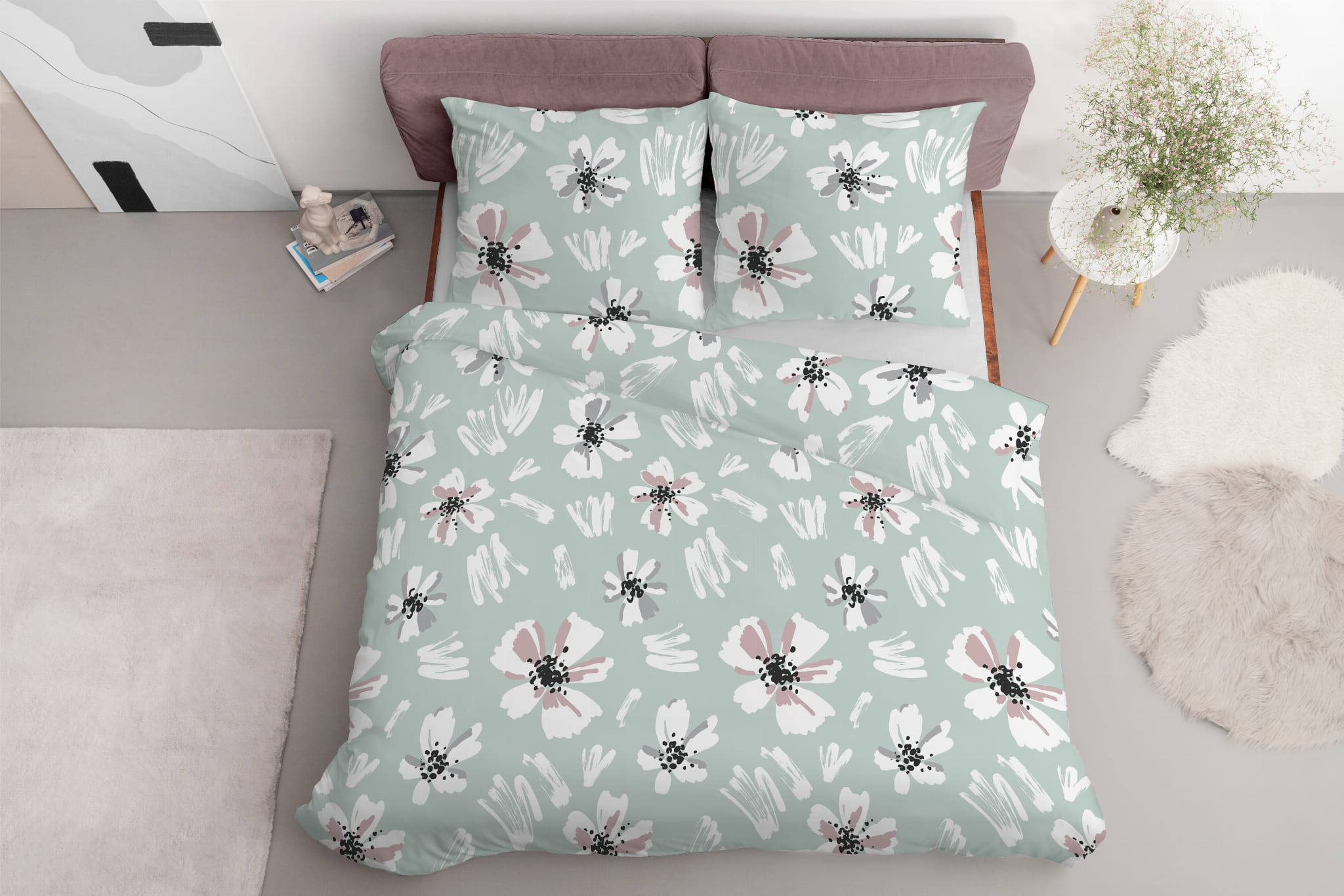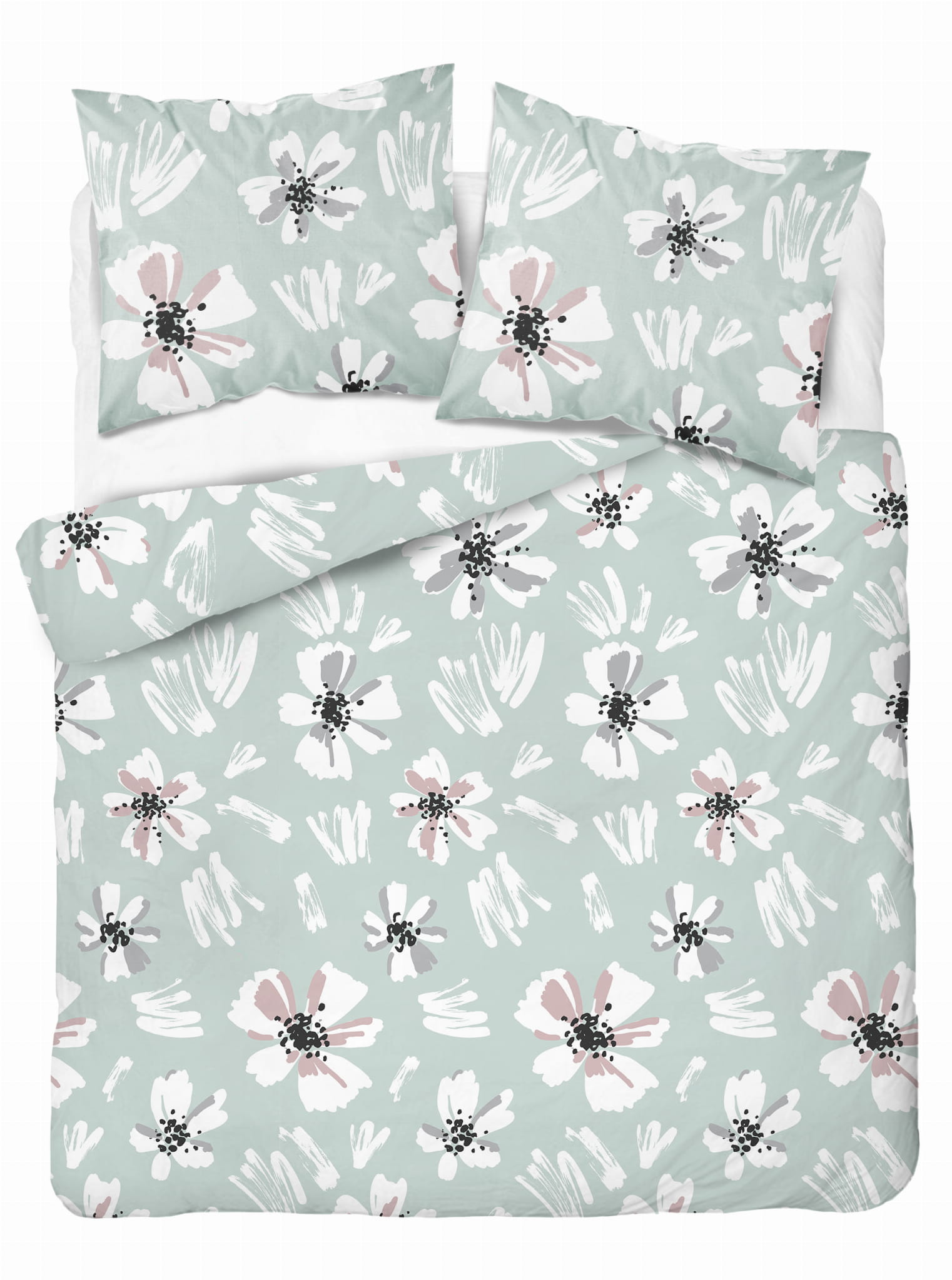 Pościel 220x200 Satynowa Mikrofibra Kwiaty Miętowa