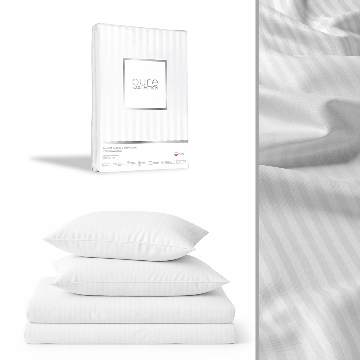 Pościel Adamaszek 140x200 – Gładka Satynowa w Pasy Premium | Biała