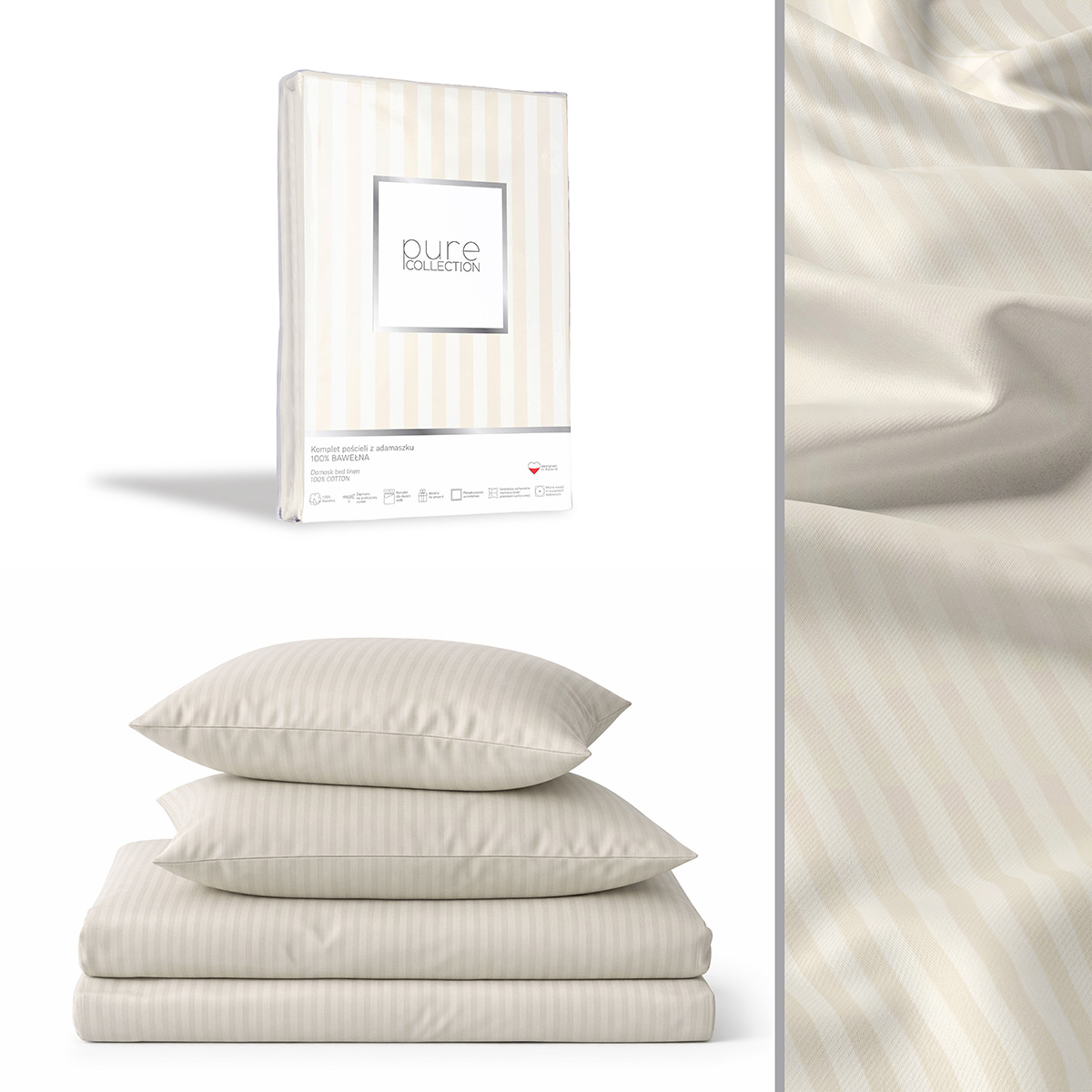 Pościel Adamaszek 140x200 – Gładka Satynowa w Pasy Premium | Kremowa