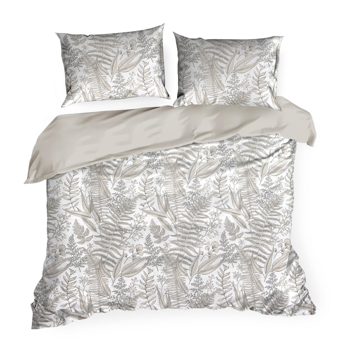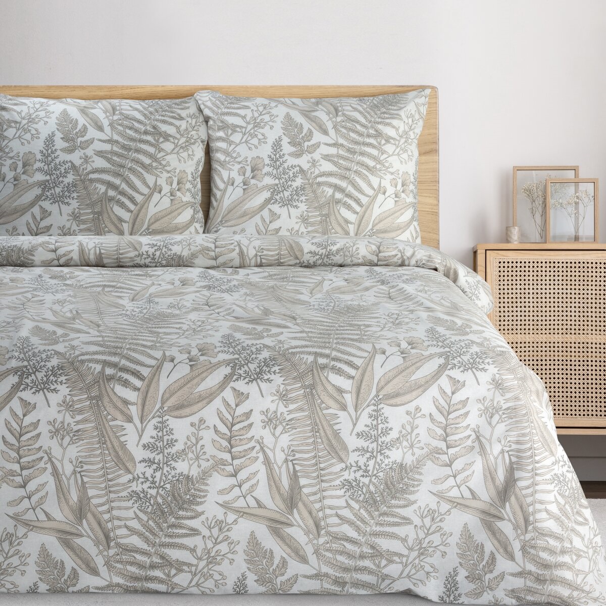 Wybierz bawełnianą pościel z motywem liści i stwórz w swojej sypialni przytulną, naturalną przestrzeń sprzyjającą relaksowi.