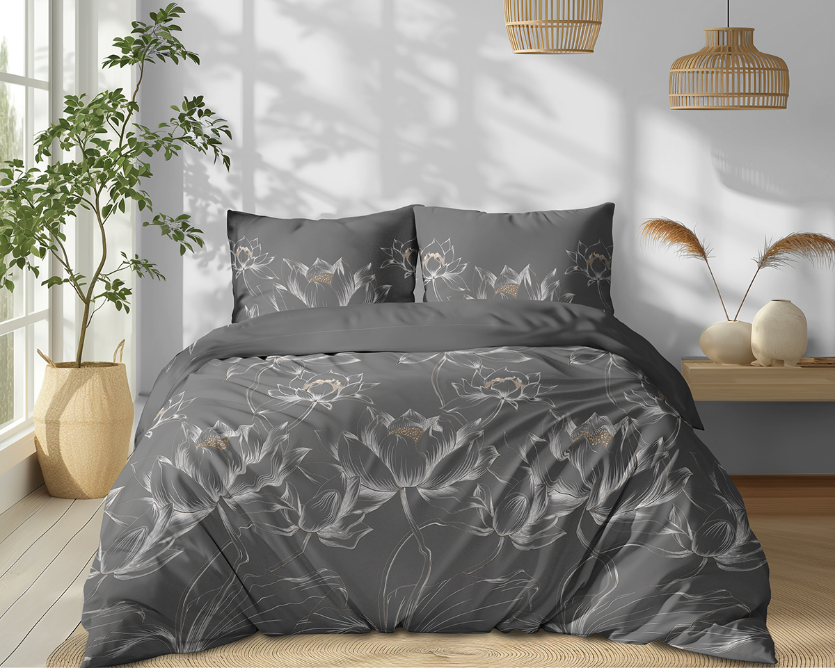 Pościel Bawełniana 160x200cm Kwiaty Liście Popielata Szara
