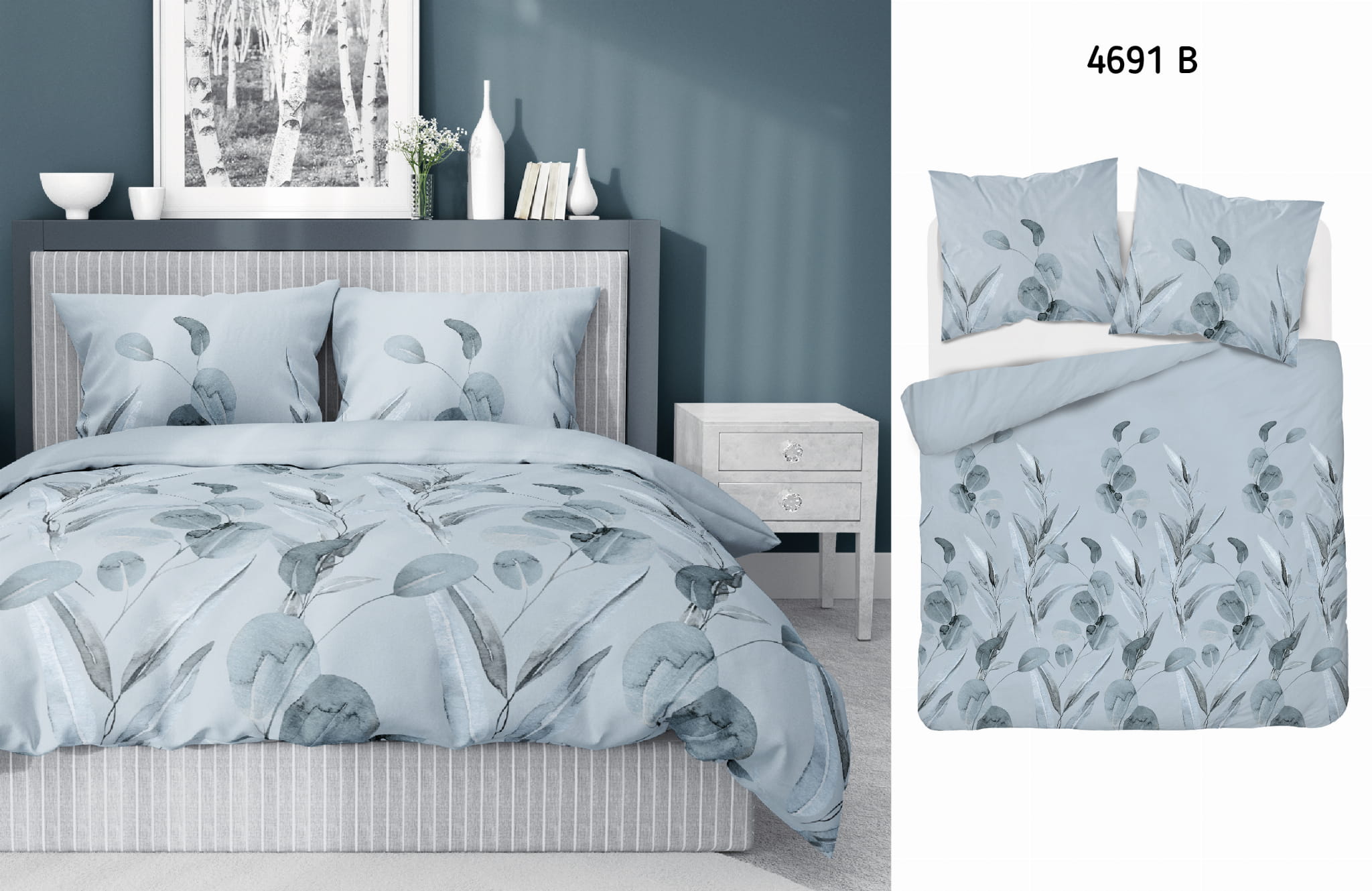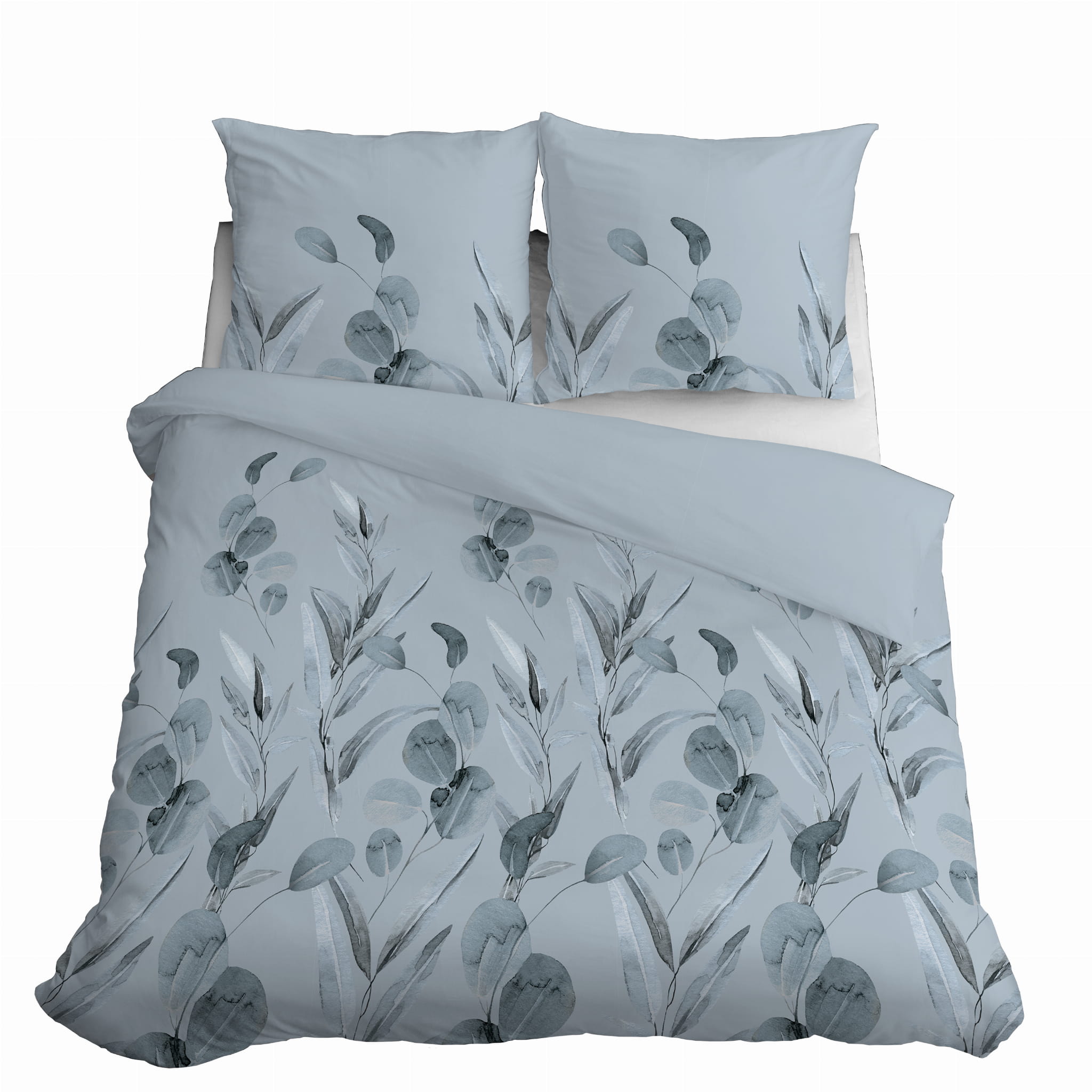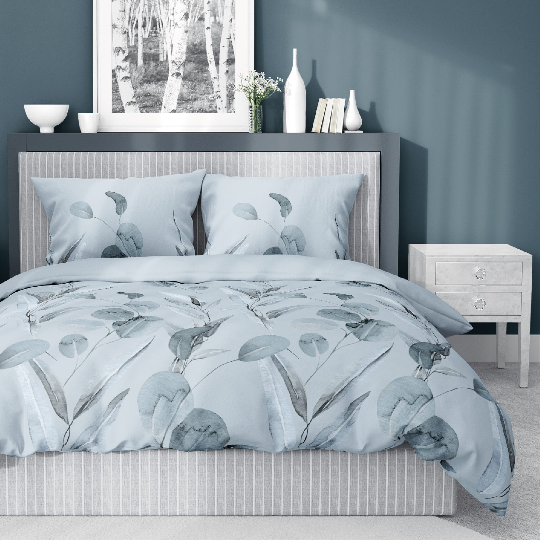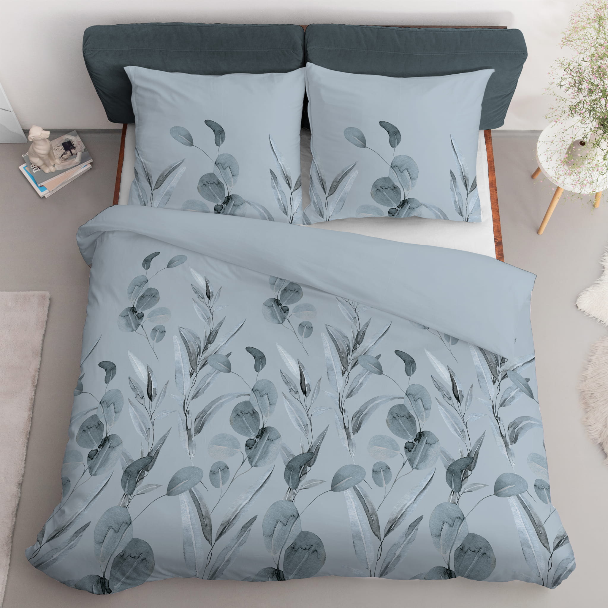 Pościel Bawełniana 220x200cm Wzór Kwiaty Niebieskie Popielate