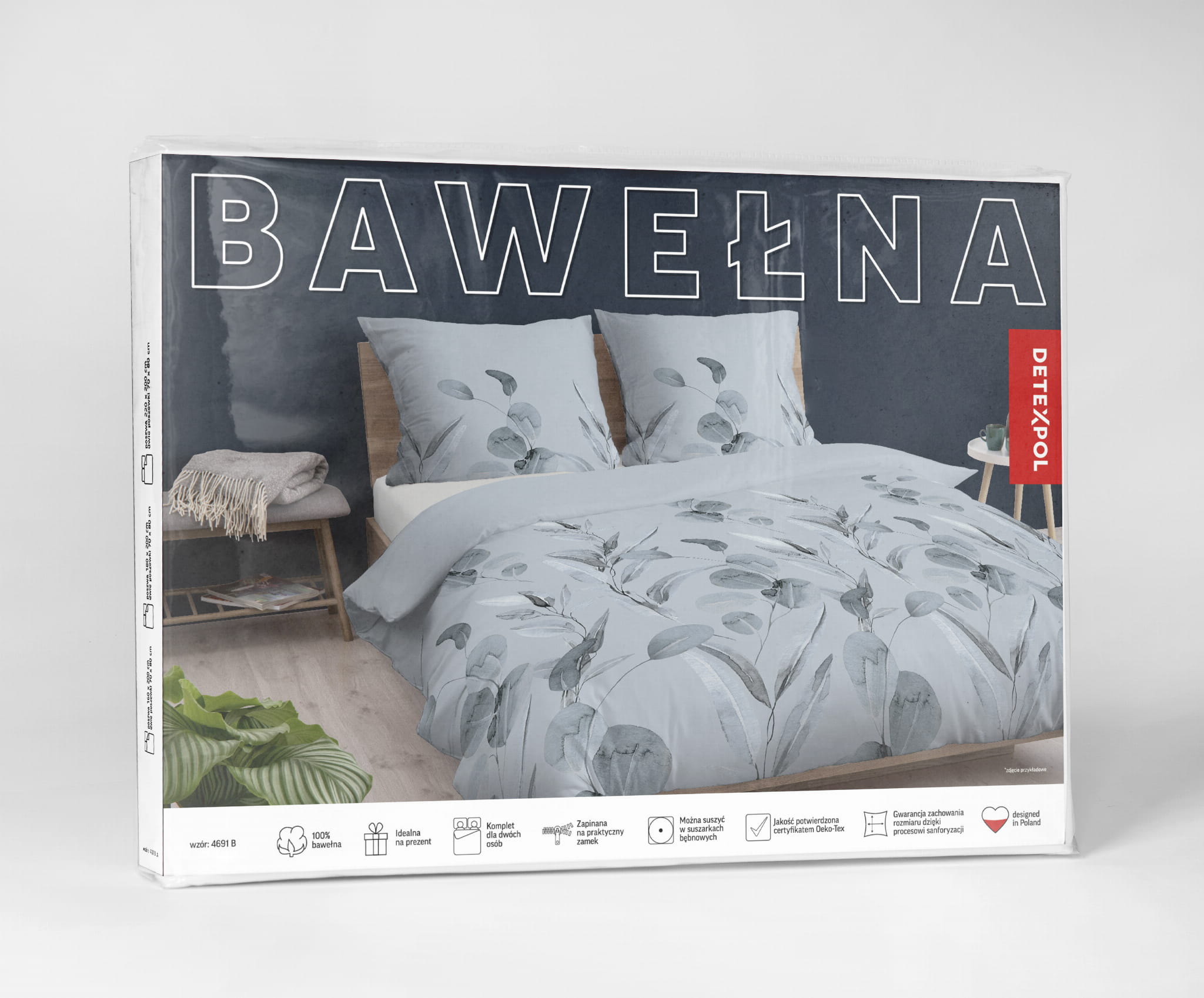 Komplet pościeli marki Detexpol zawiera poszwę na kołdrę o wymiarze 220x200 oraz dwie poszewki na poduszki o wymiarach 70x80.