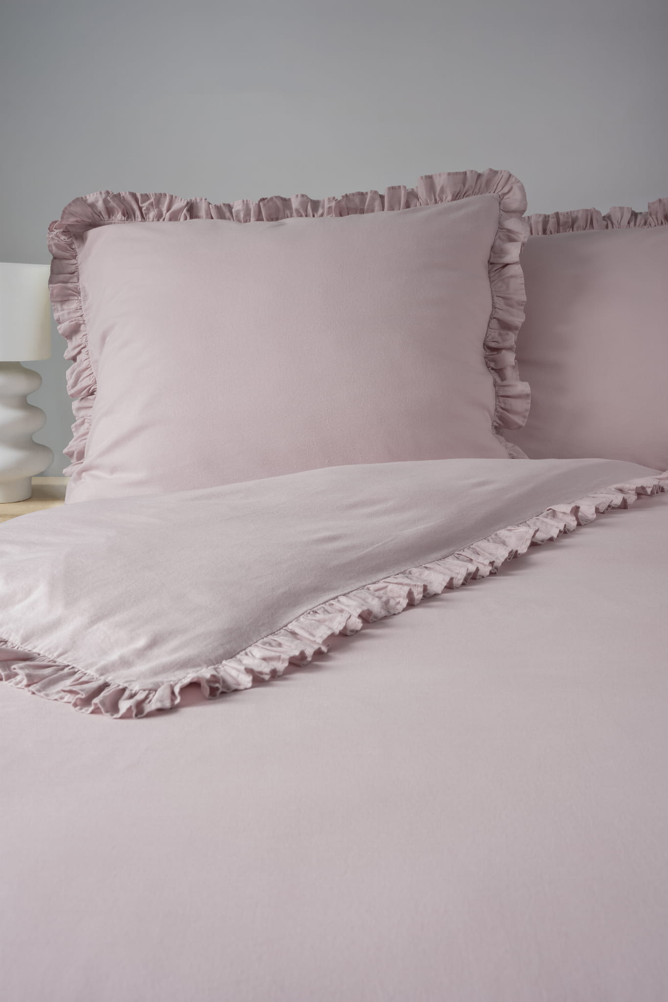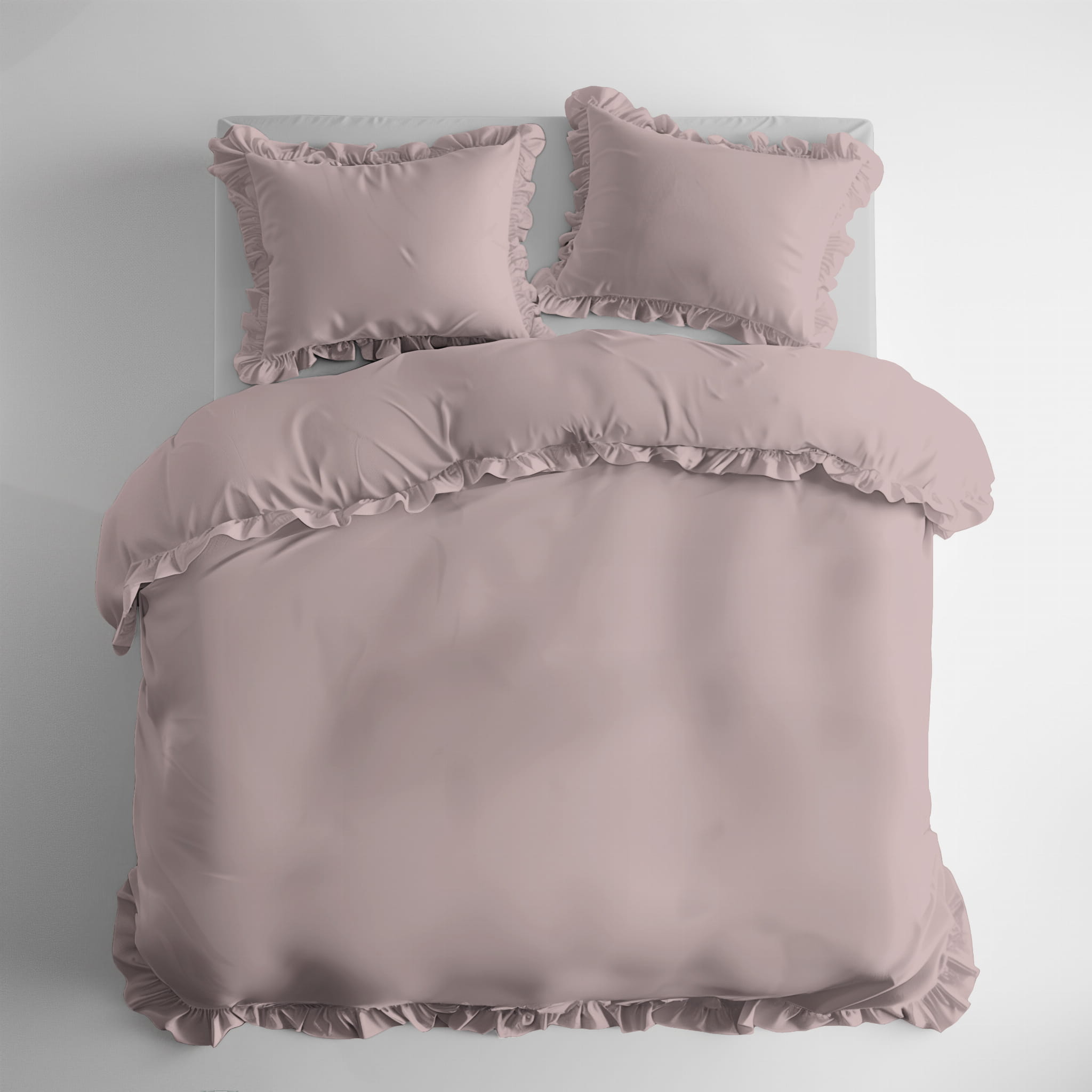 Minimalistyczny, jednokolorowy deseń z uroczą falbanką dodaje elegancji do każdego wnętrza sypialni. Jednorodna kolorystyka kompletu umożliwia łatwe dostosowanie do różnych stylów i kolorów pomieszczeń, nadając im spójną spokojną atmosferę.