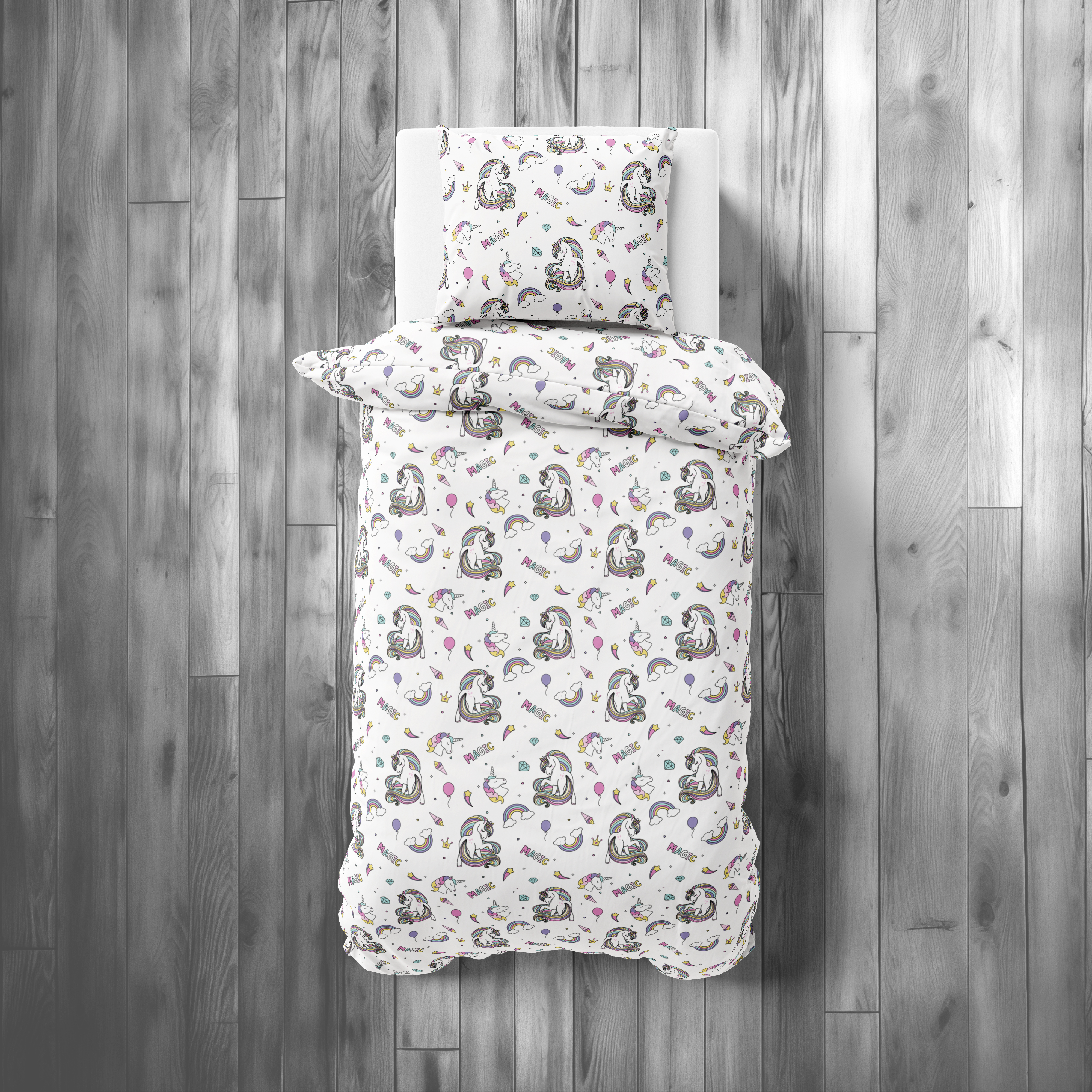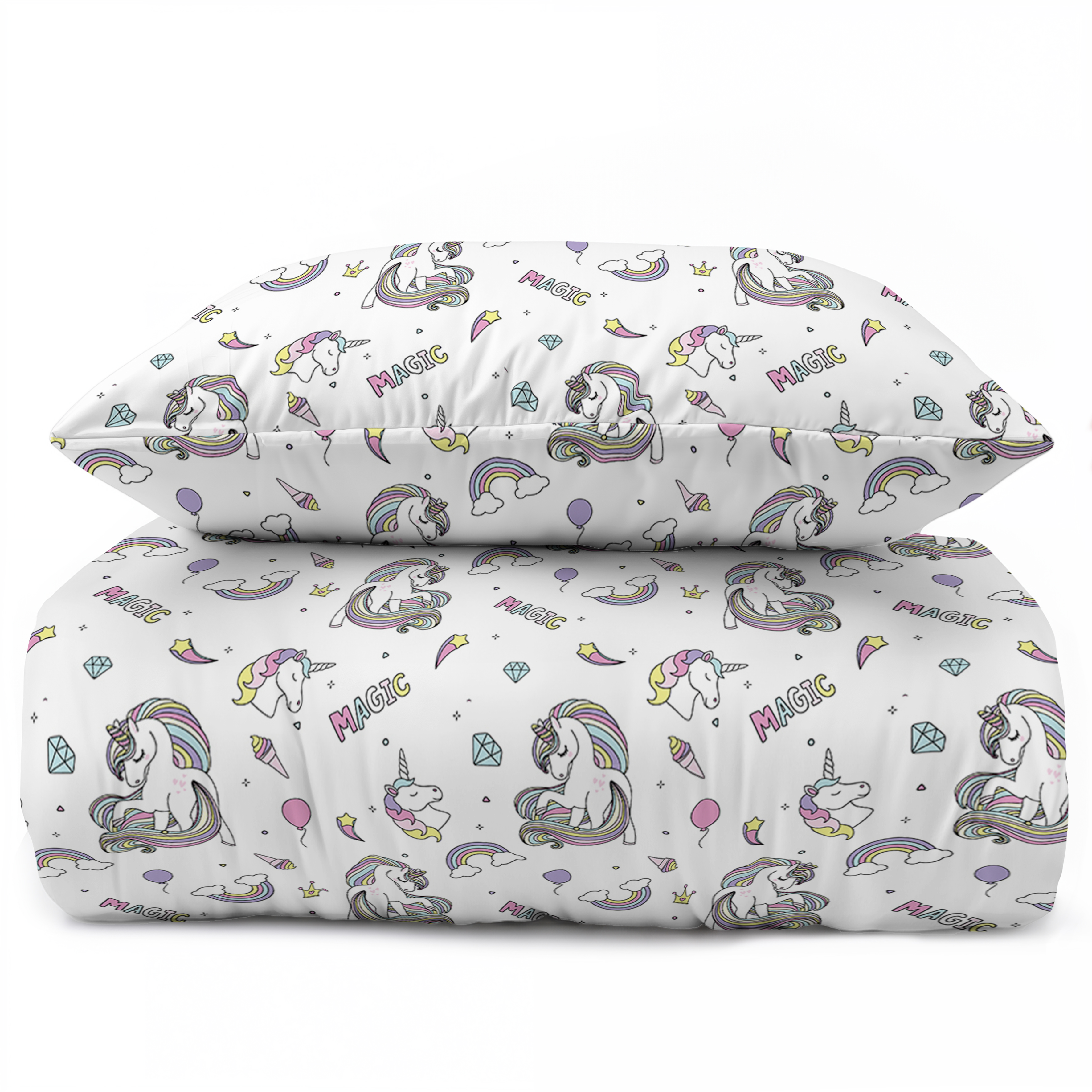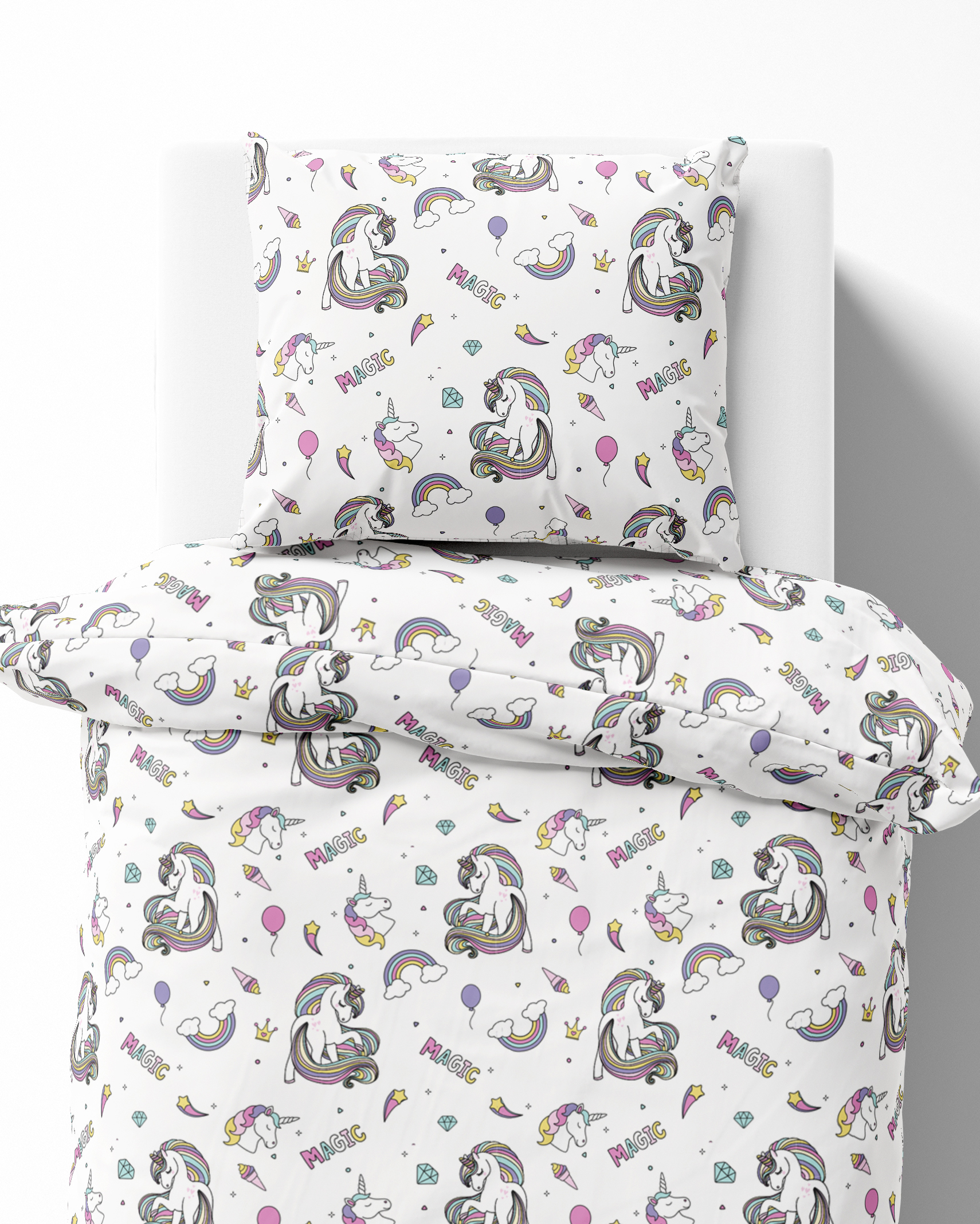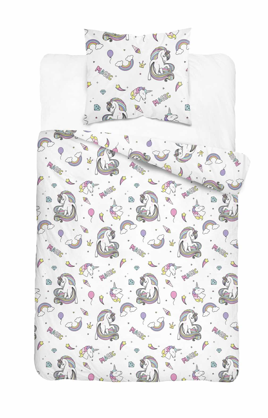 Pościel dziecięca ze wzorem w jednorożce/unicorn została wykonana ze 100% przyjaznej skórze bawełny. Gwarantuje zdrowy i komfortowy sen dla każdego użytkownika. Pościele z tej serii to ciekawe propozycje dla dzieci i młodzieży. Pościel wyposażona jest w praktyczne zapięcia na zamek.
