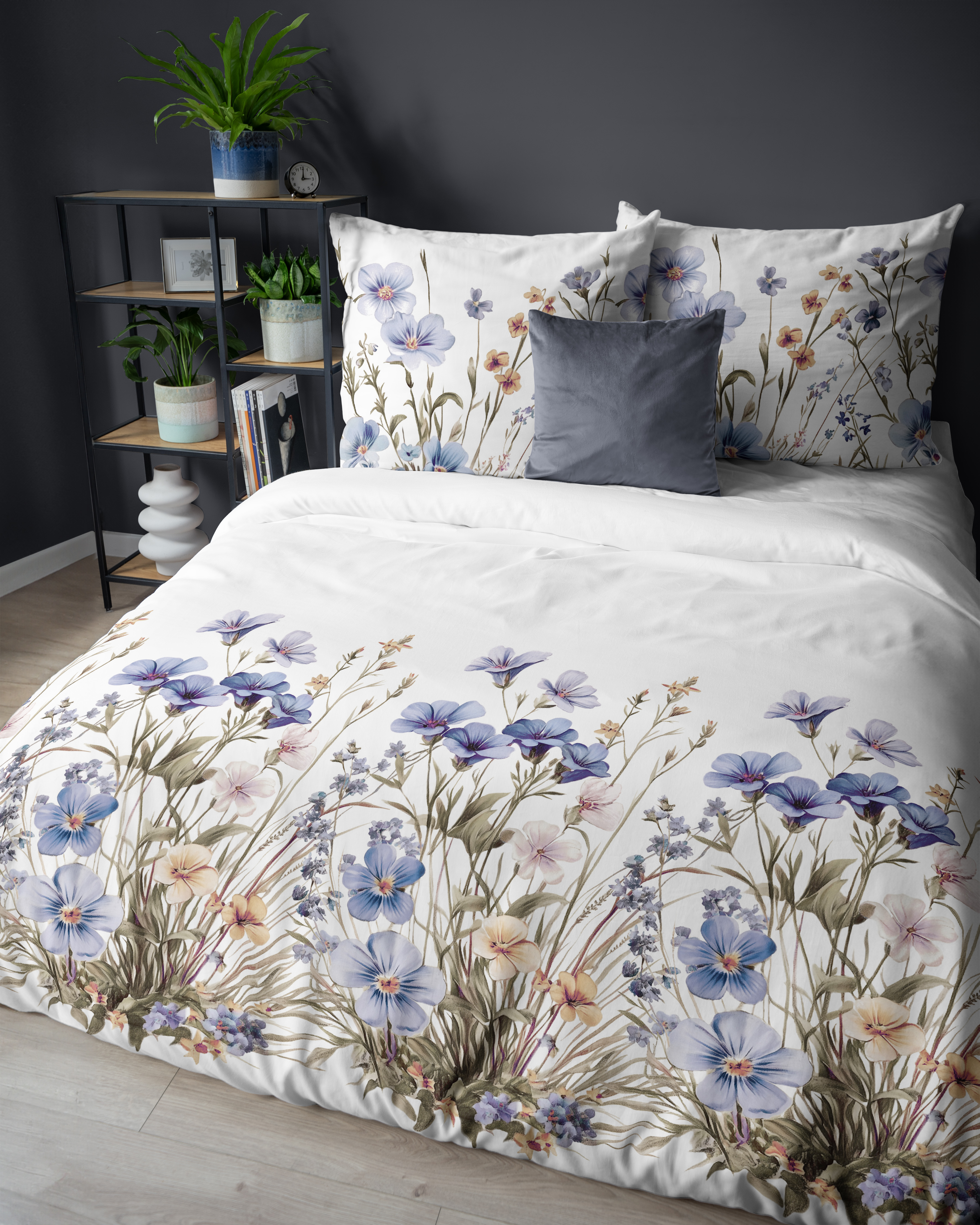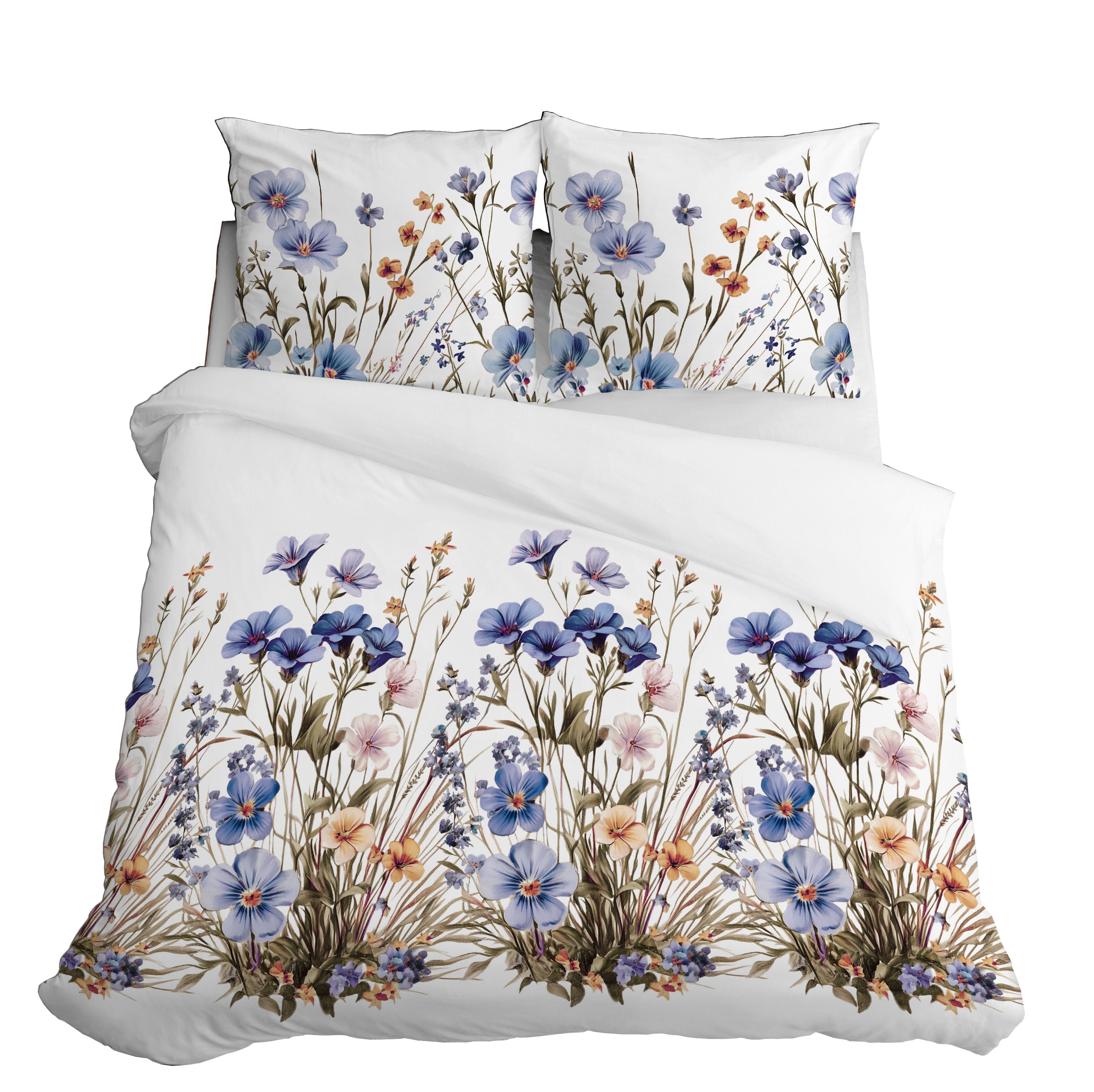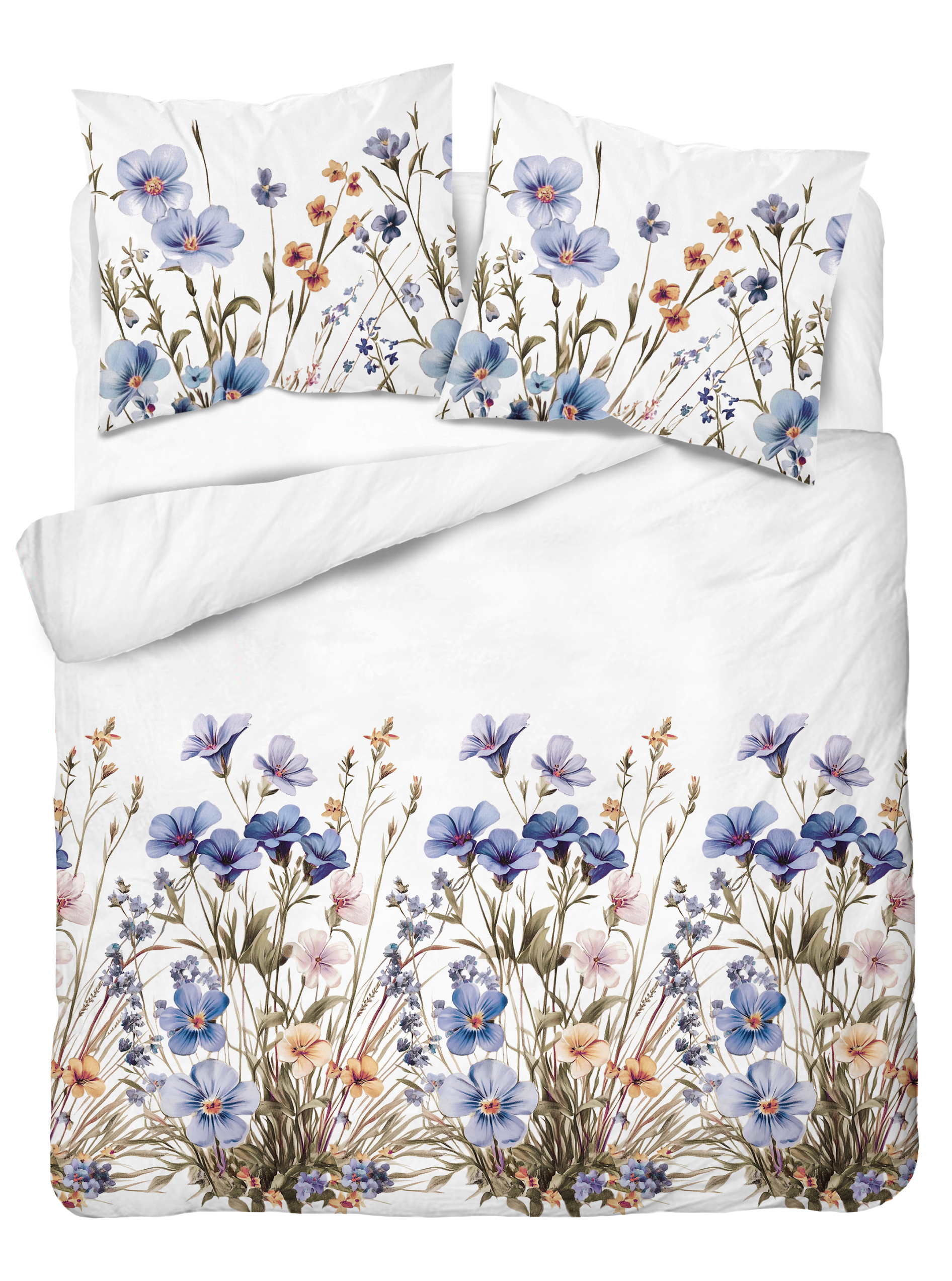 Pościel Satynowa 160x200 Kwietna Łąka w niebieskich kwiatach