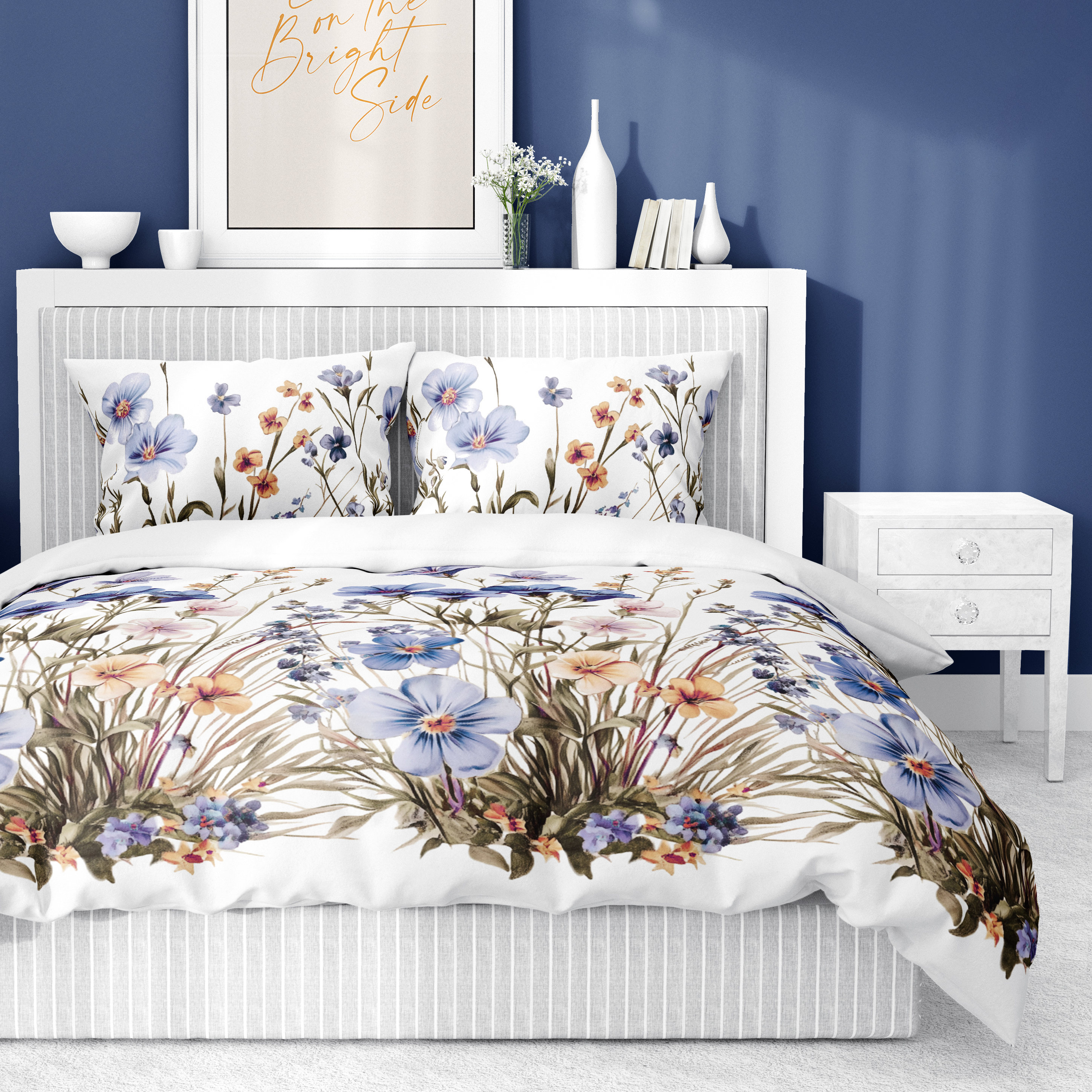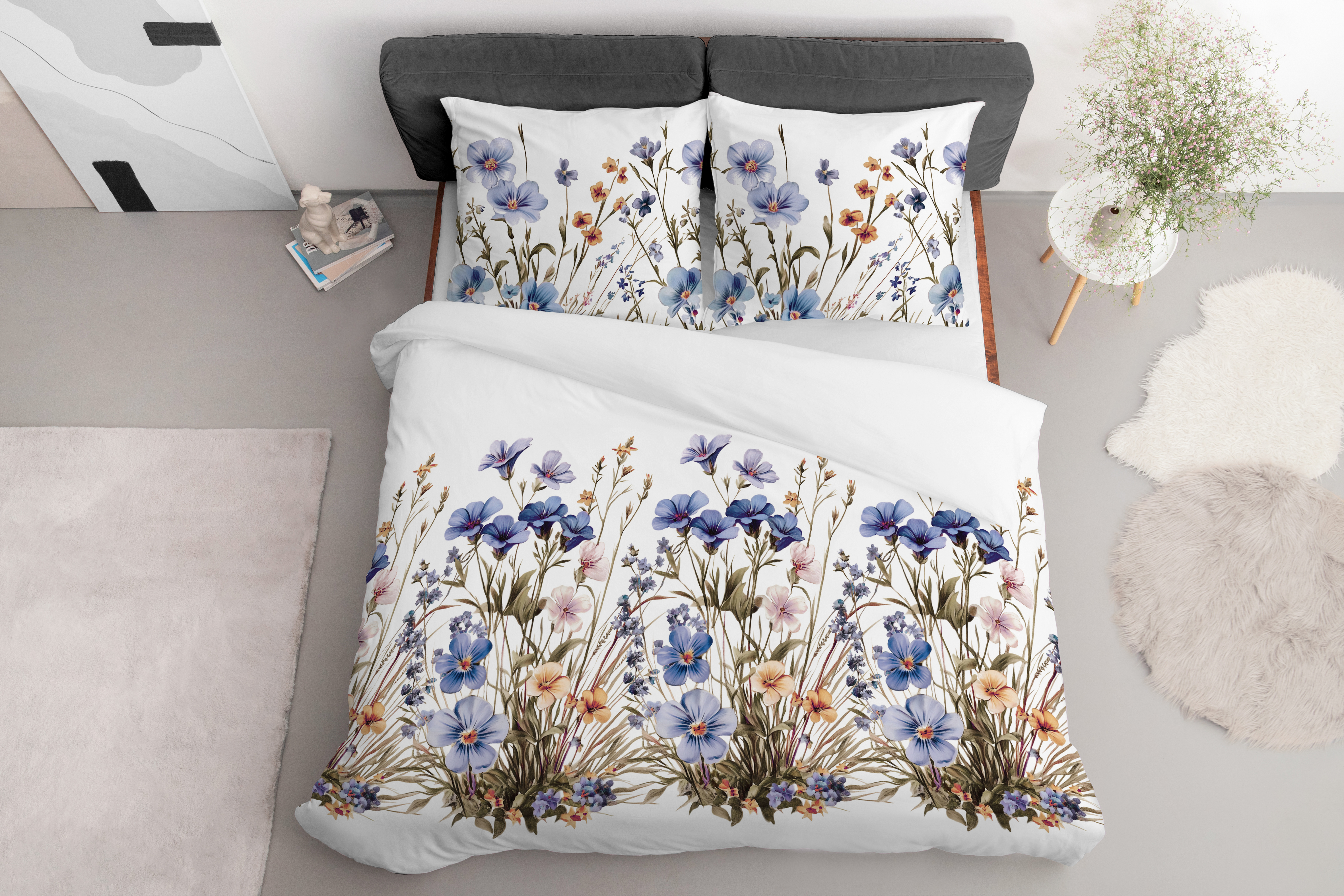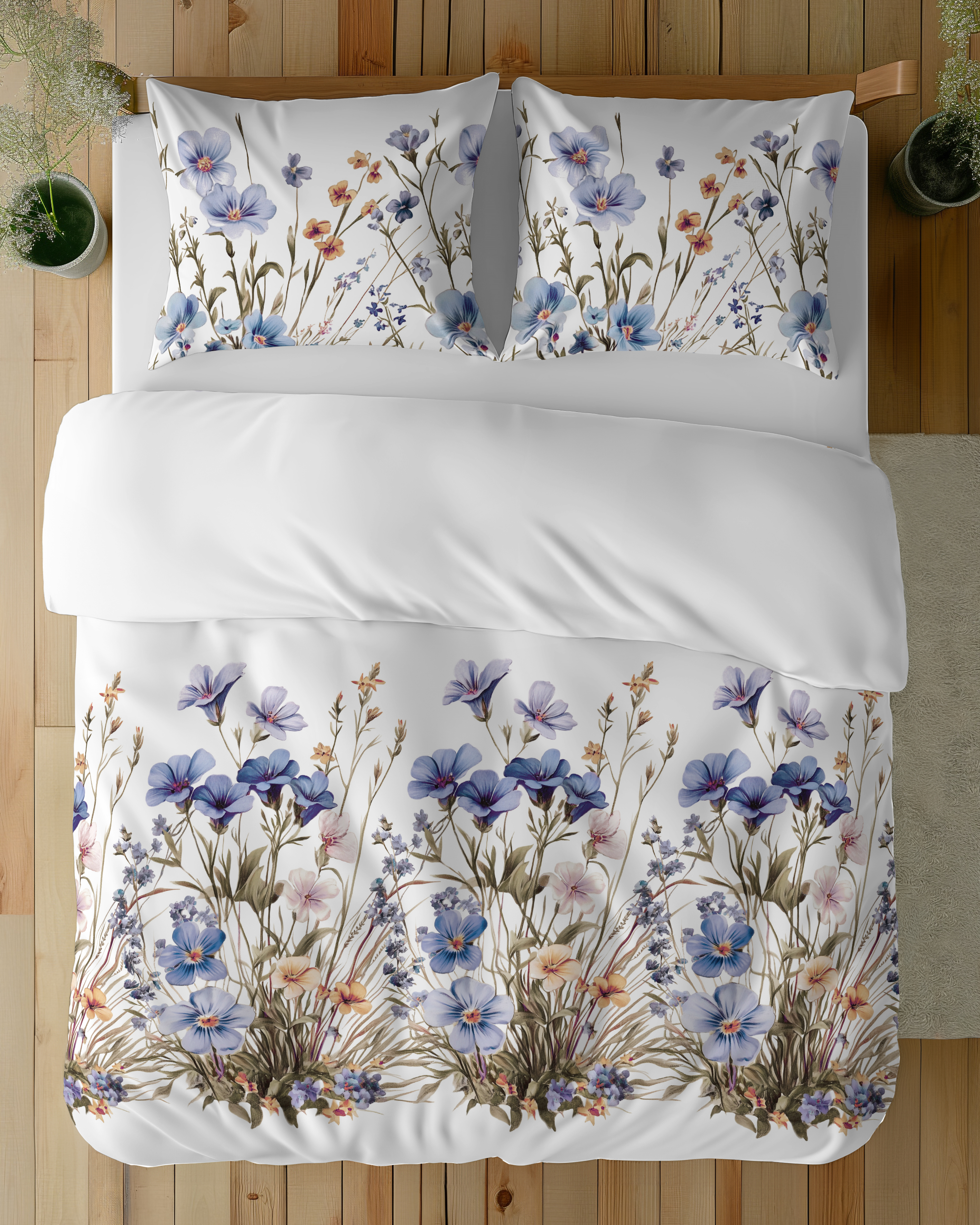 Pościel Satynowa 160x200 Kwietna Łąka w niebieskich kwiatach