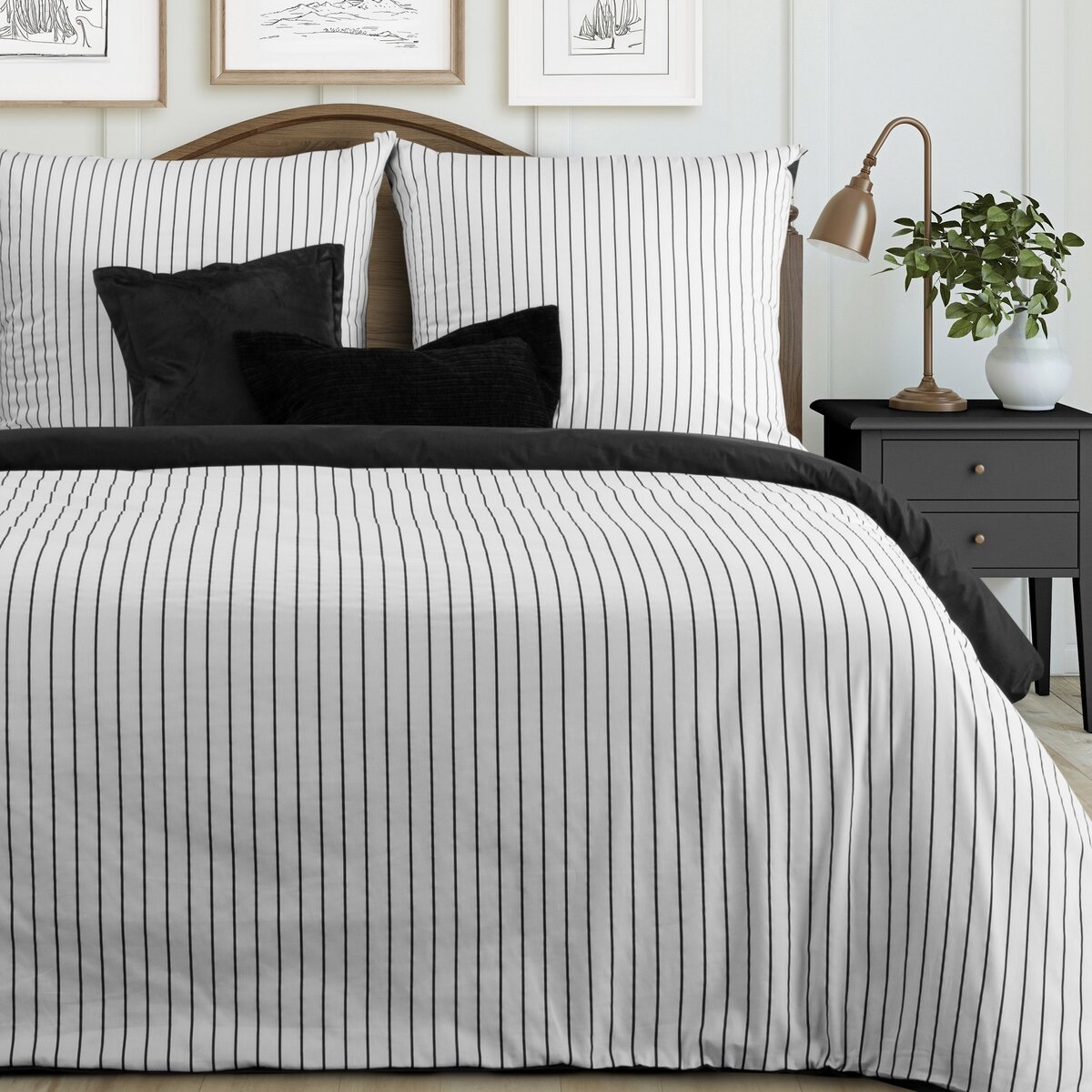 Pościel satynowa w biało-czarne pasy to idealne połączenie designu i komfortu — świetny wybór do nowoczesnej sypialni.