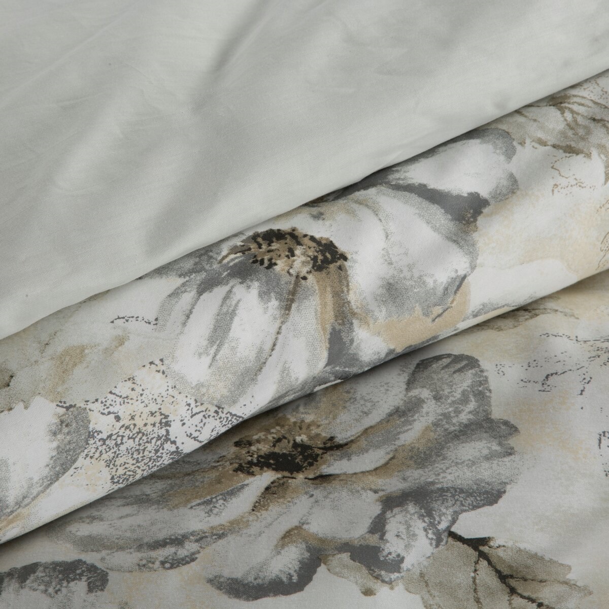 Pościel satynowa 220x200 Liście & Kwiaty – jasnobeżowa / jasnoszara | 100% bawełna