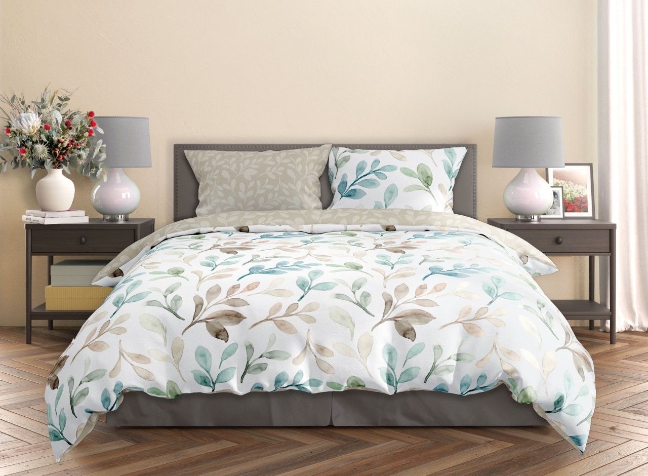 Piękna kontrastująca pościel pokryta kolorowymi liśćmi i kwiatów to idealny dodatek do nowoczesnych wnętrz.