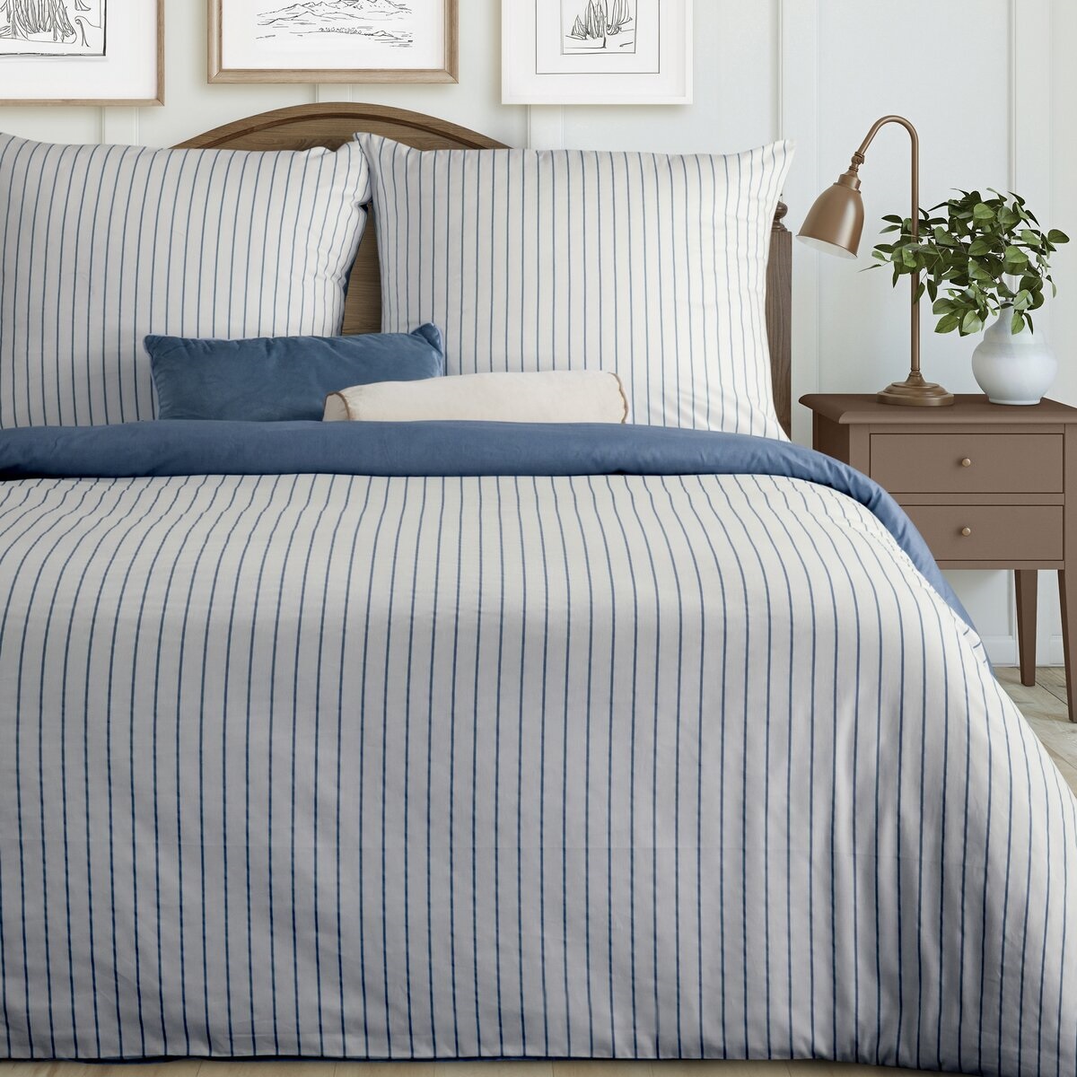 Pościel Satynowa 220x200 cm Paski – biało-granatowa