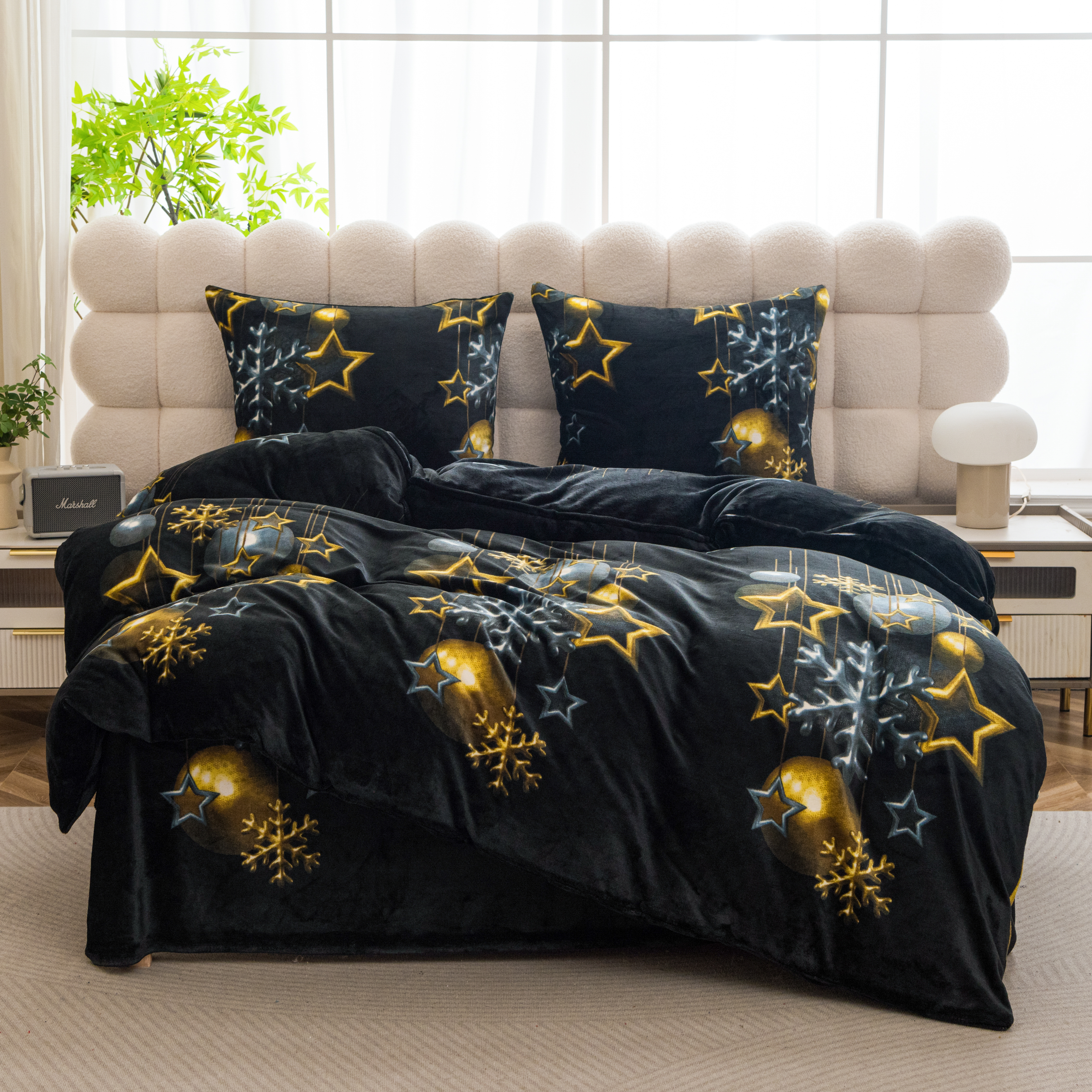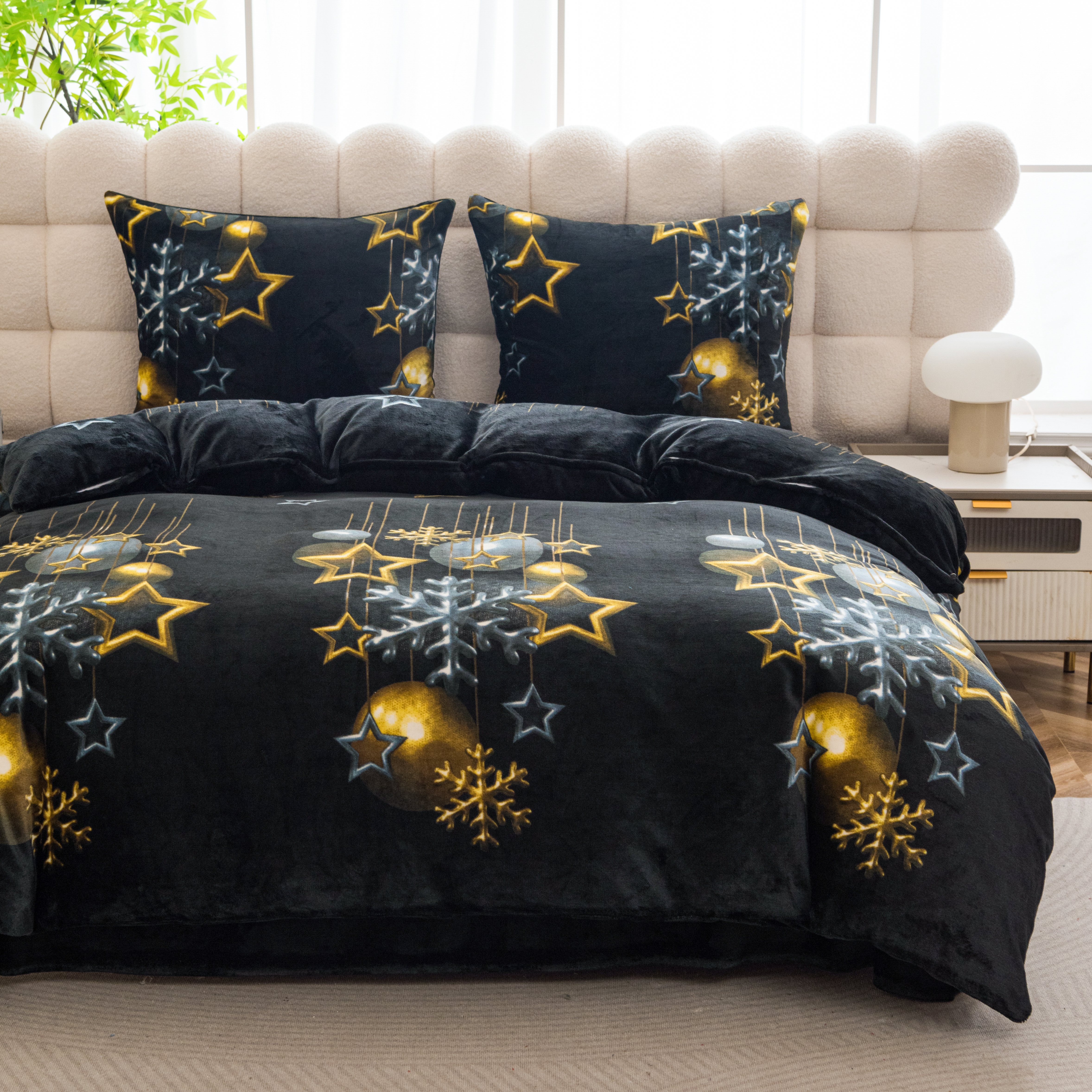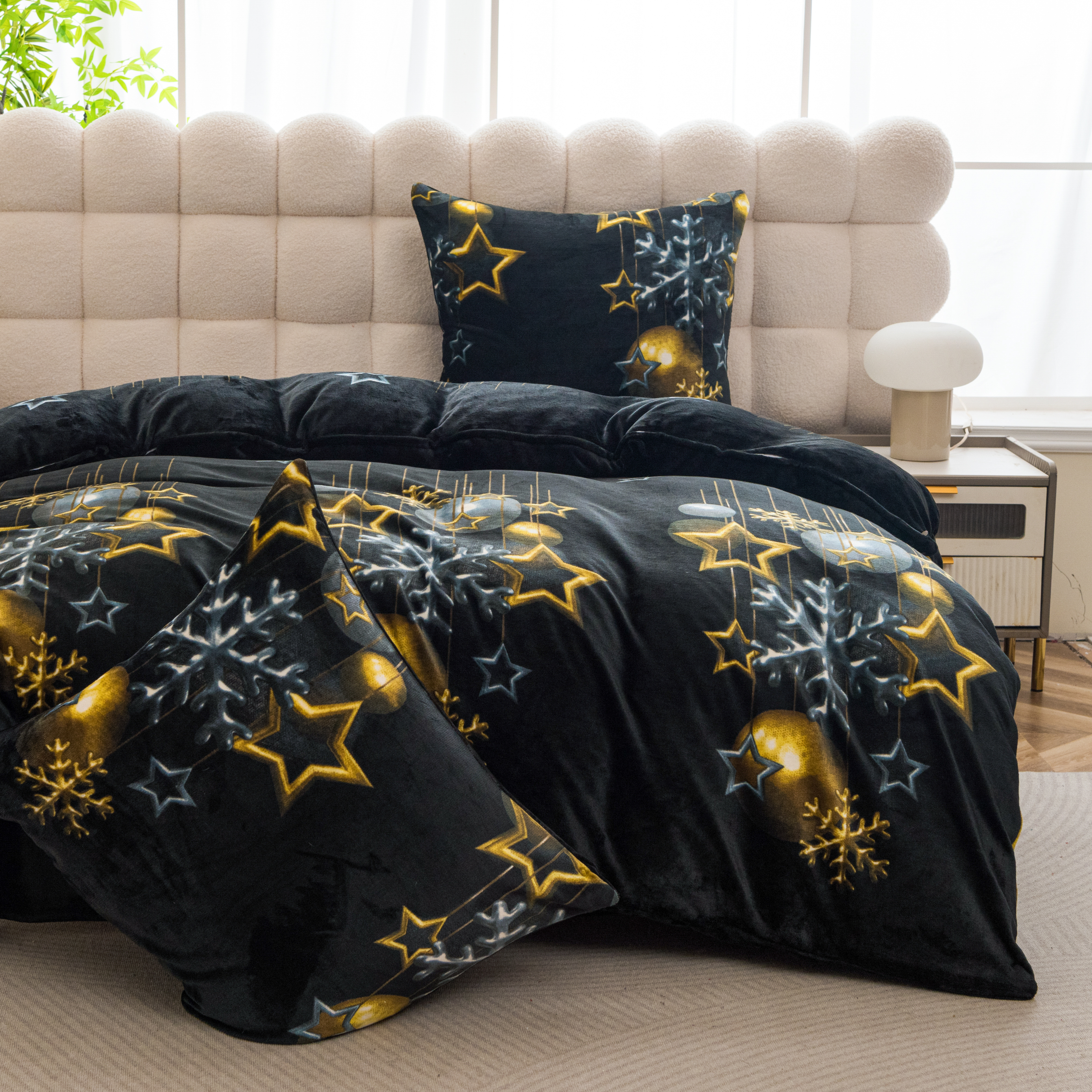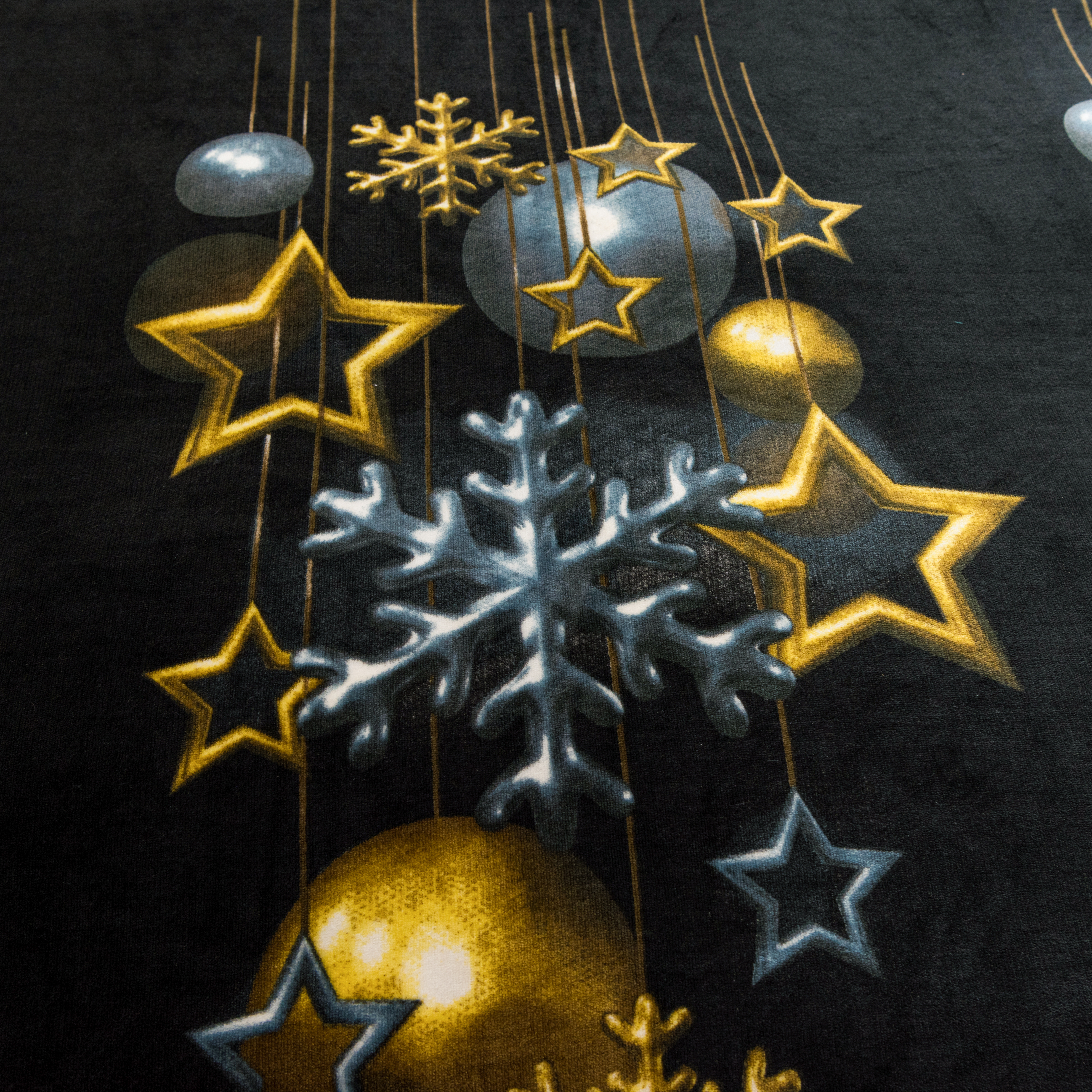 Pościel Świąteczna 140x200 Gwiazdki Bombki Złote Pluszowa Czarna