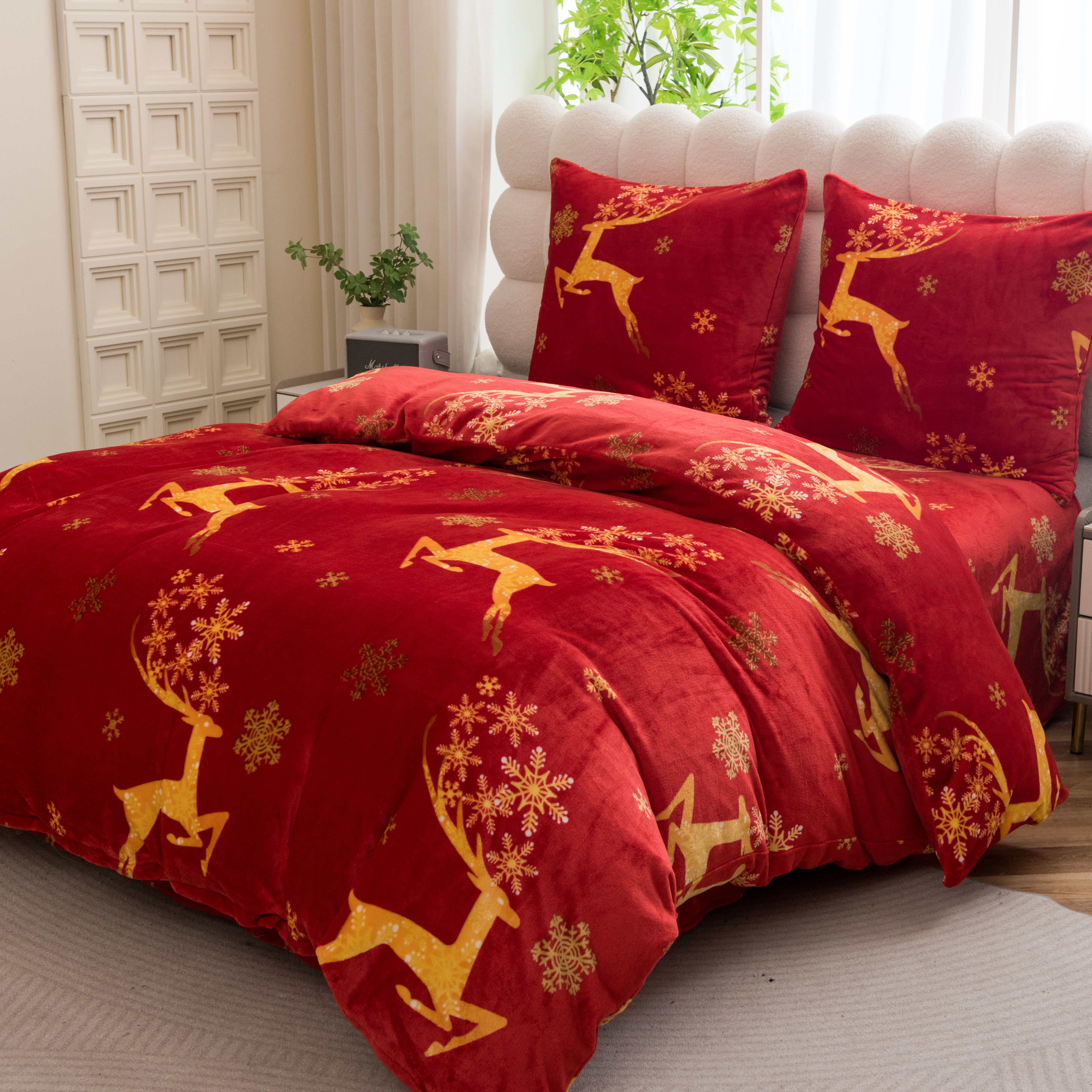 Pościel Świąteczna 160x200 Renifery Złote Czerwona Pluszowa