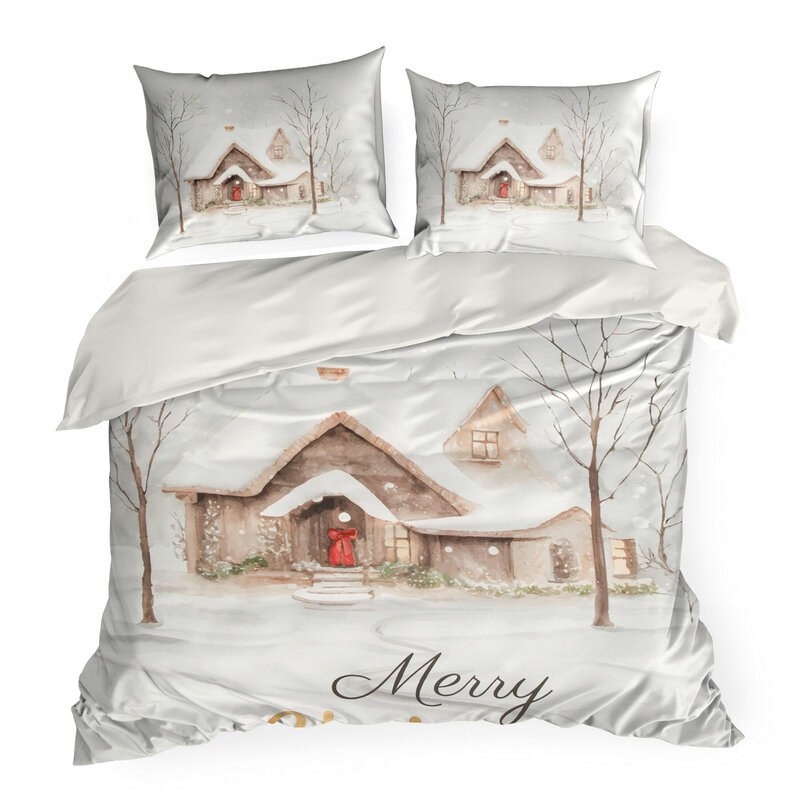 Pościel Świąteczna Satynowa 220x200 Merry Christmas Domek Jasna