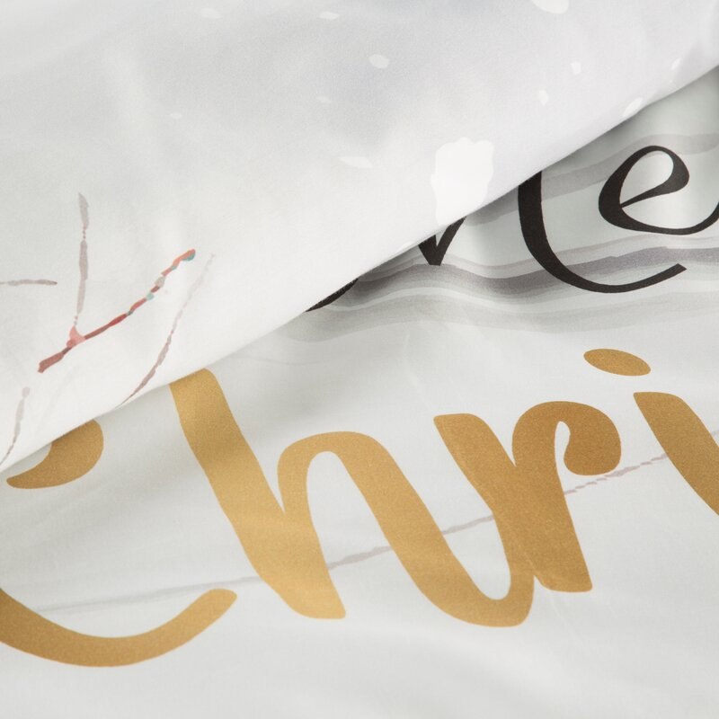 Delikatny, jasnoszary odcień tła oraz biały, świąteczny nadruk z motywem lasu i zimowych akcentów tworzą harmonijną kompozycję, która wprowadzi do wnętrza przytulność i magiczną atmosferę. Satynowa tkanina zachwyca subtelnym połyskiem, gładkością oraz przyjemnością dotyku, zapewniając komfort snu przez całą noc.