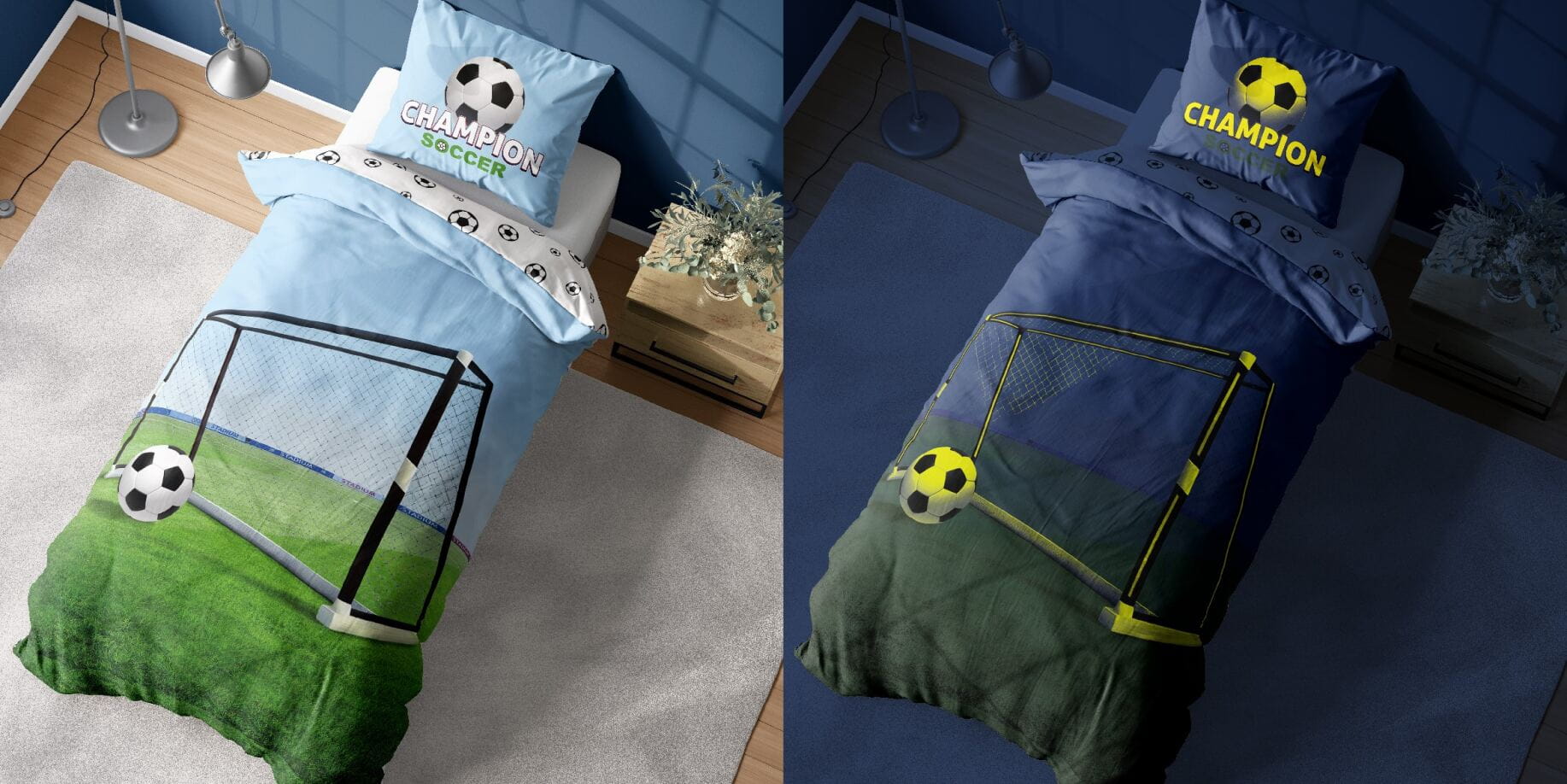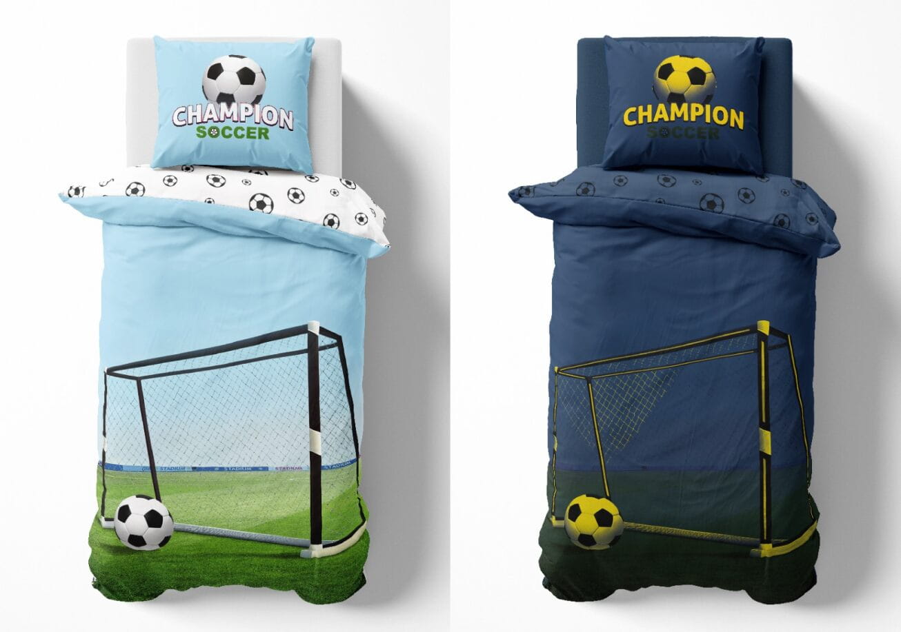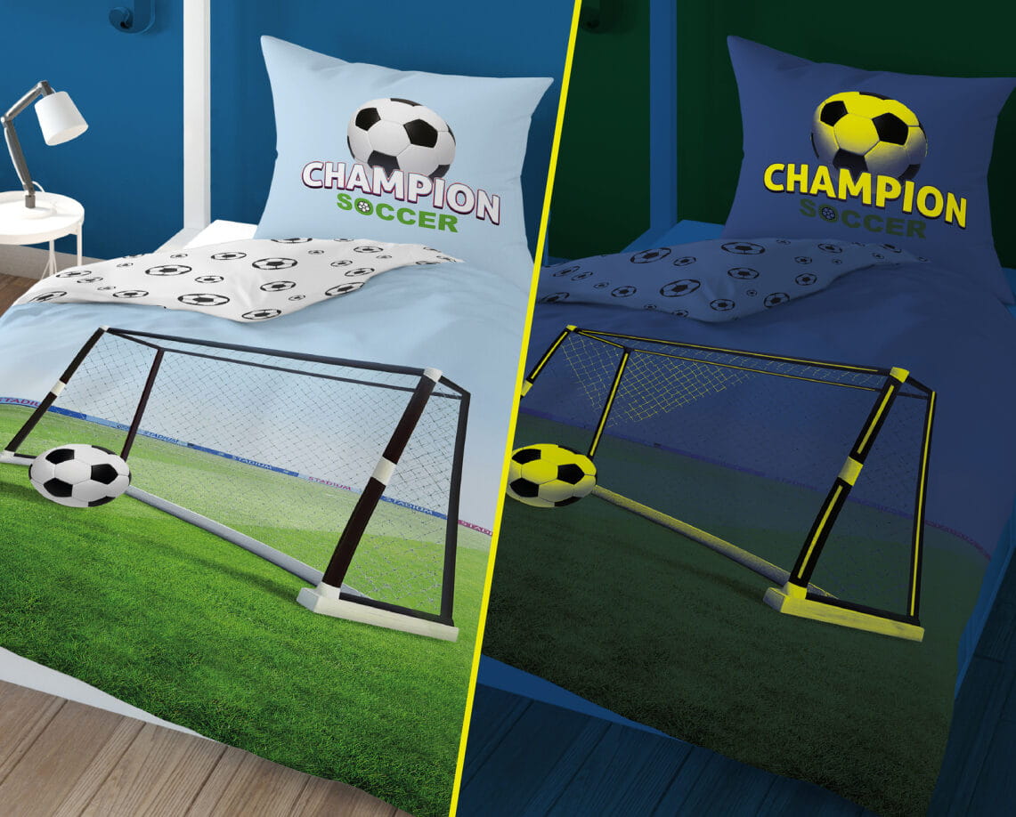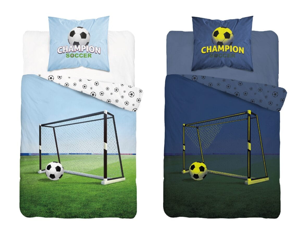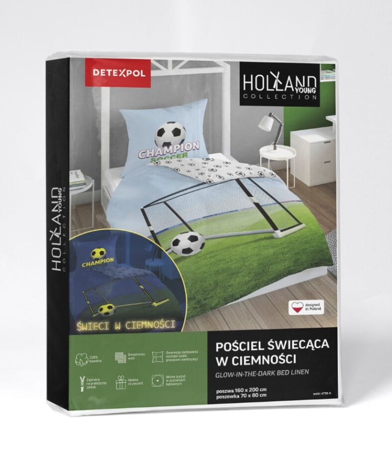 Pościel świecąca w ciemności z wizerunkiem piłki futbolowej. Pościel młodzieżowa PIŁKA BOISKO, idealna dla sympatyka futbolu.