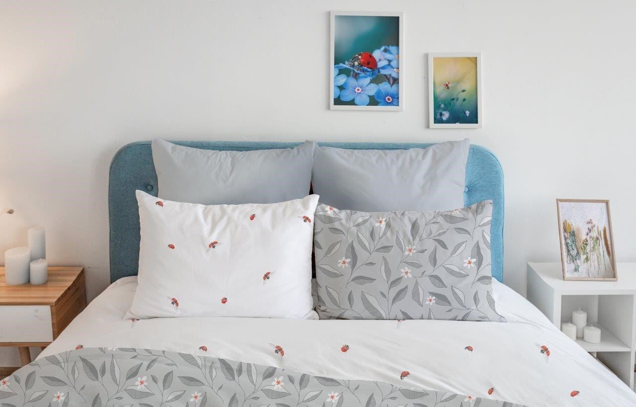 Piękna kontrastująca pościel pokryta kolorowymi kwiatami to idealny dodatek do nowoczesnych wnętrz.