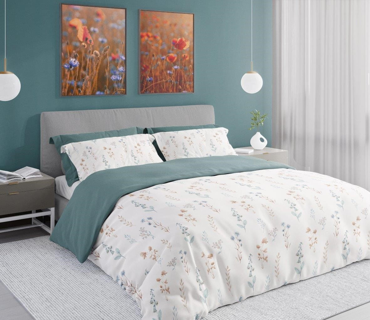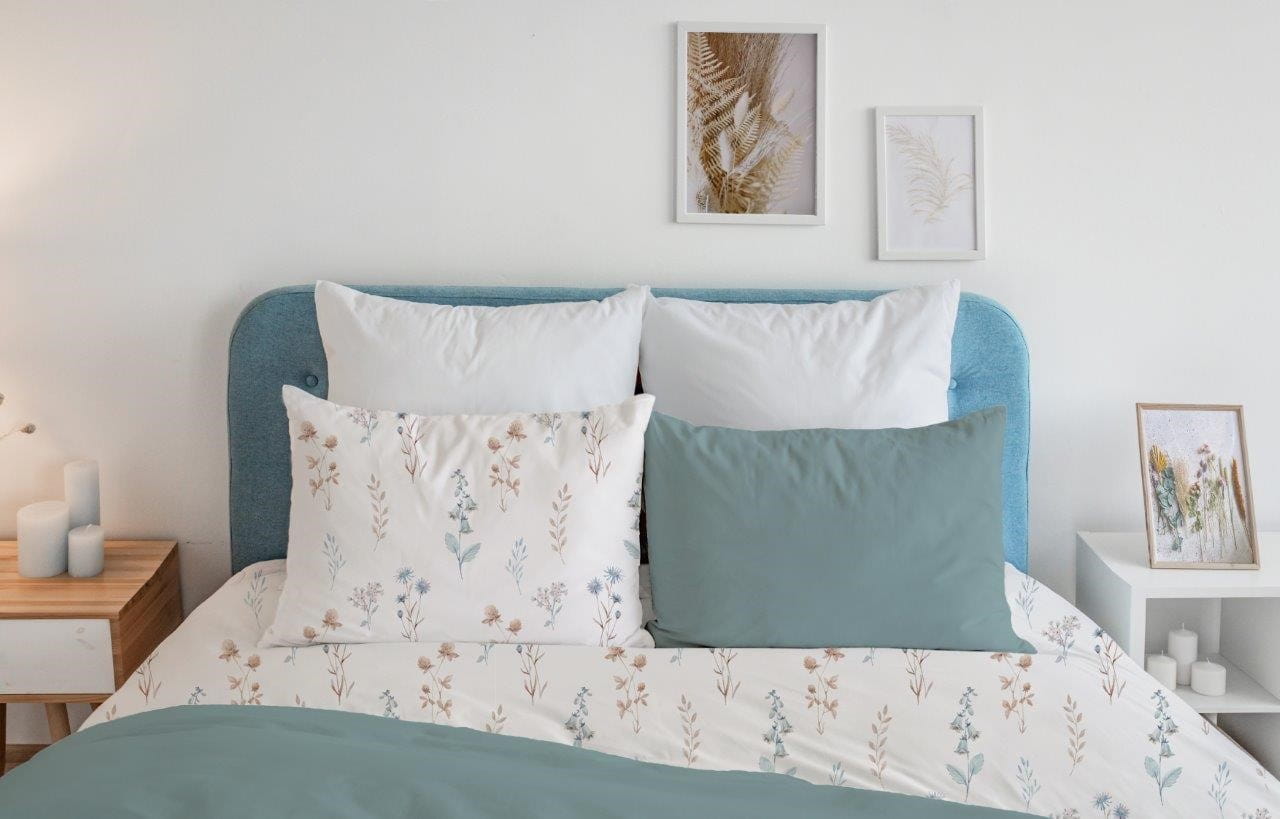 Piękna kontrastująca pościel pokryta kolorowymi kwiatami to idealny dodatek do nowoczesnych wnętrz.