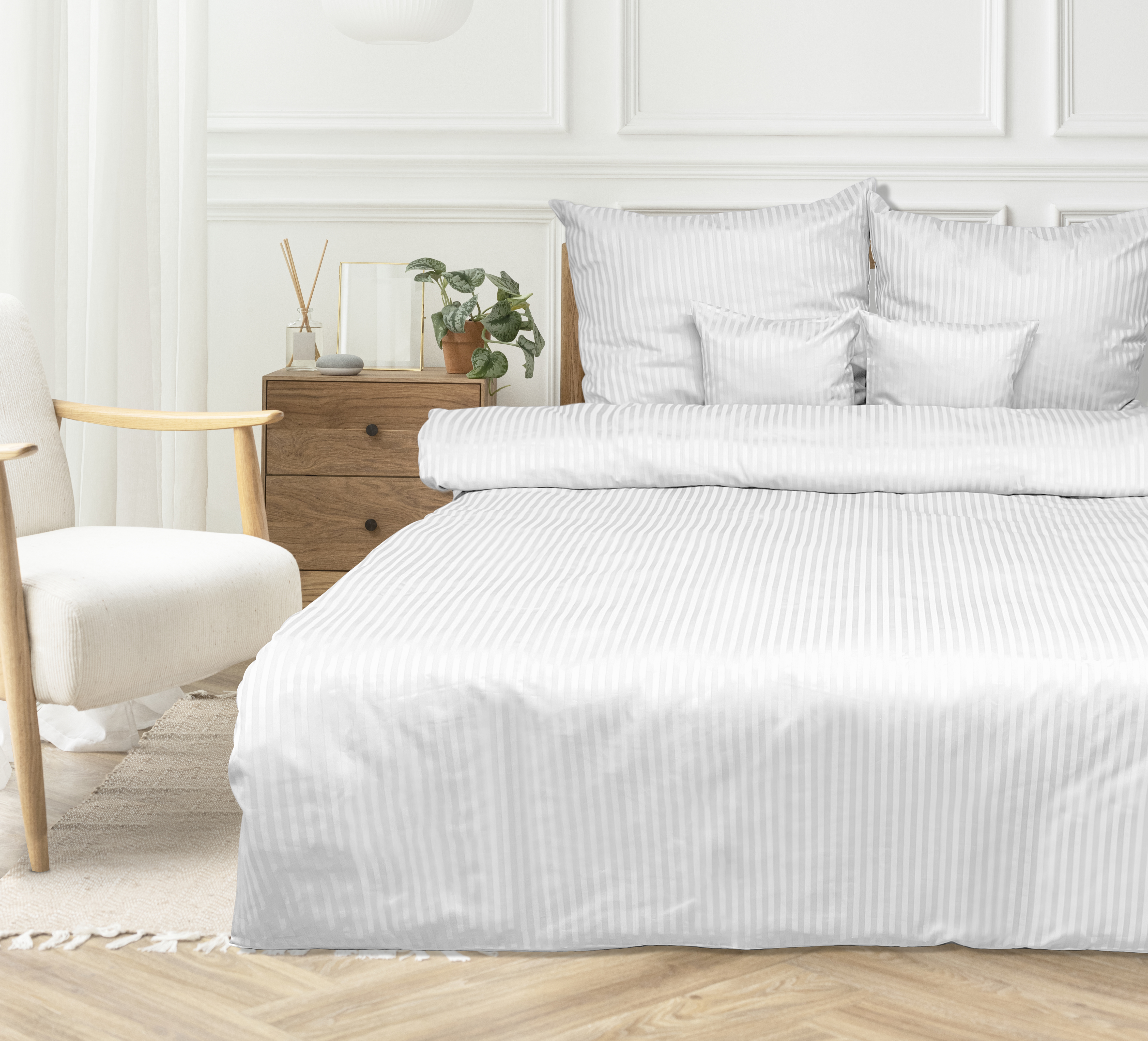 Wprowadź do swojej sypialni nutę luksusu dzięki eleganckiej pościeli z adamaszku w klasyczne paski o szerokości 1 cm. Wykonana w 100% z wysokiej jakości bawełny, pościel zapewnia wyjątkowy komfort snu, trwałość i elegancki wygląd z delikatnym połyskiem charakterystycznym dla adamaszku.