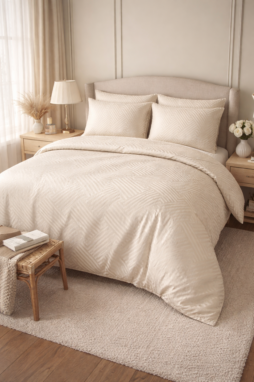 Elegancka i ponadczasowa pościel z adamaszku to idealny wybór dla osób ceniących wysoką jakość oraz klasyczny design. Subtelny, geometryczny wzór w paski o szerokości 1 cm nadaje jej luksusowy charakter i sprawia, że doskonale pasuje zarówno do nowoczesnych, jak i tradycyjnych sypialni.