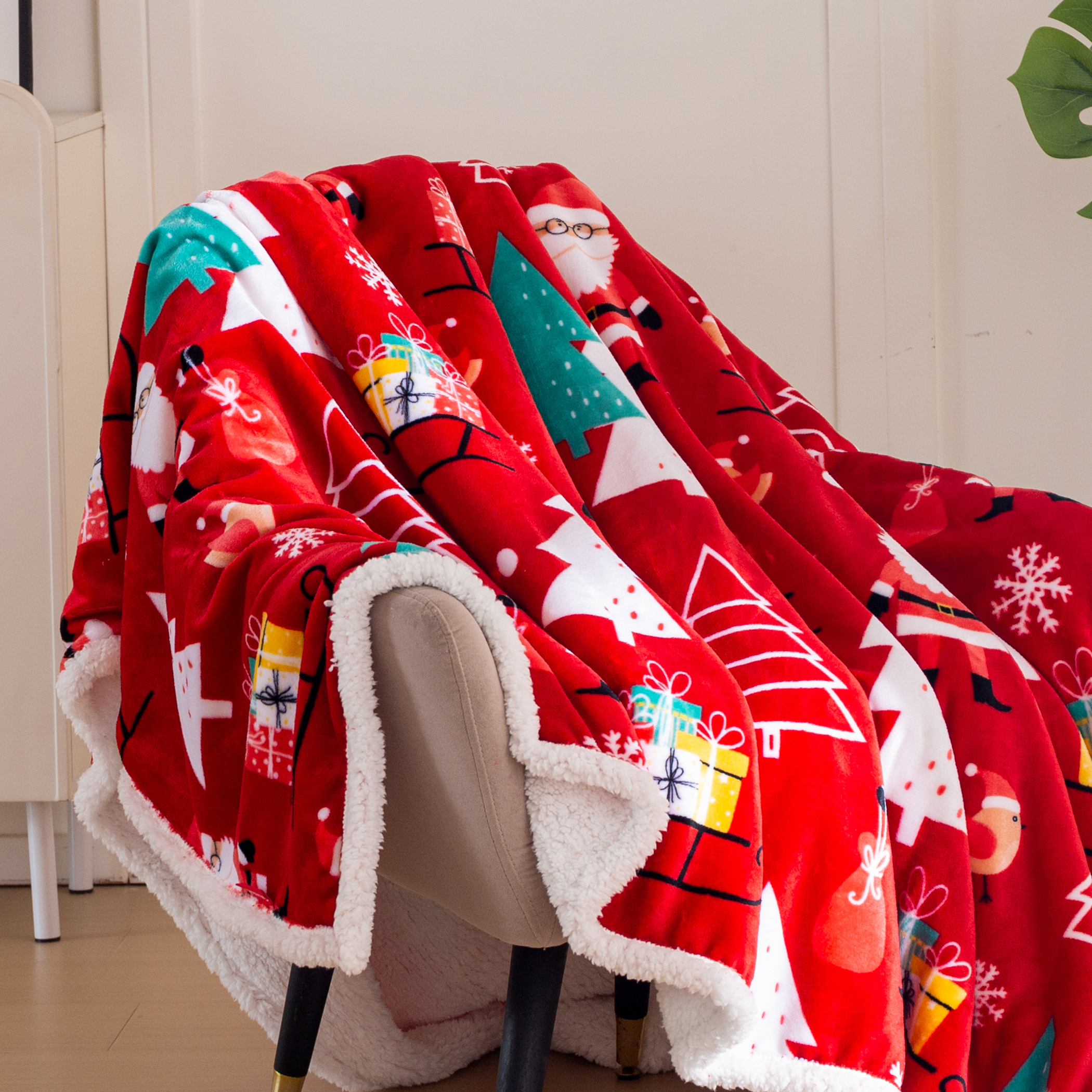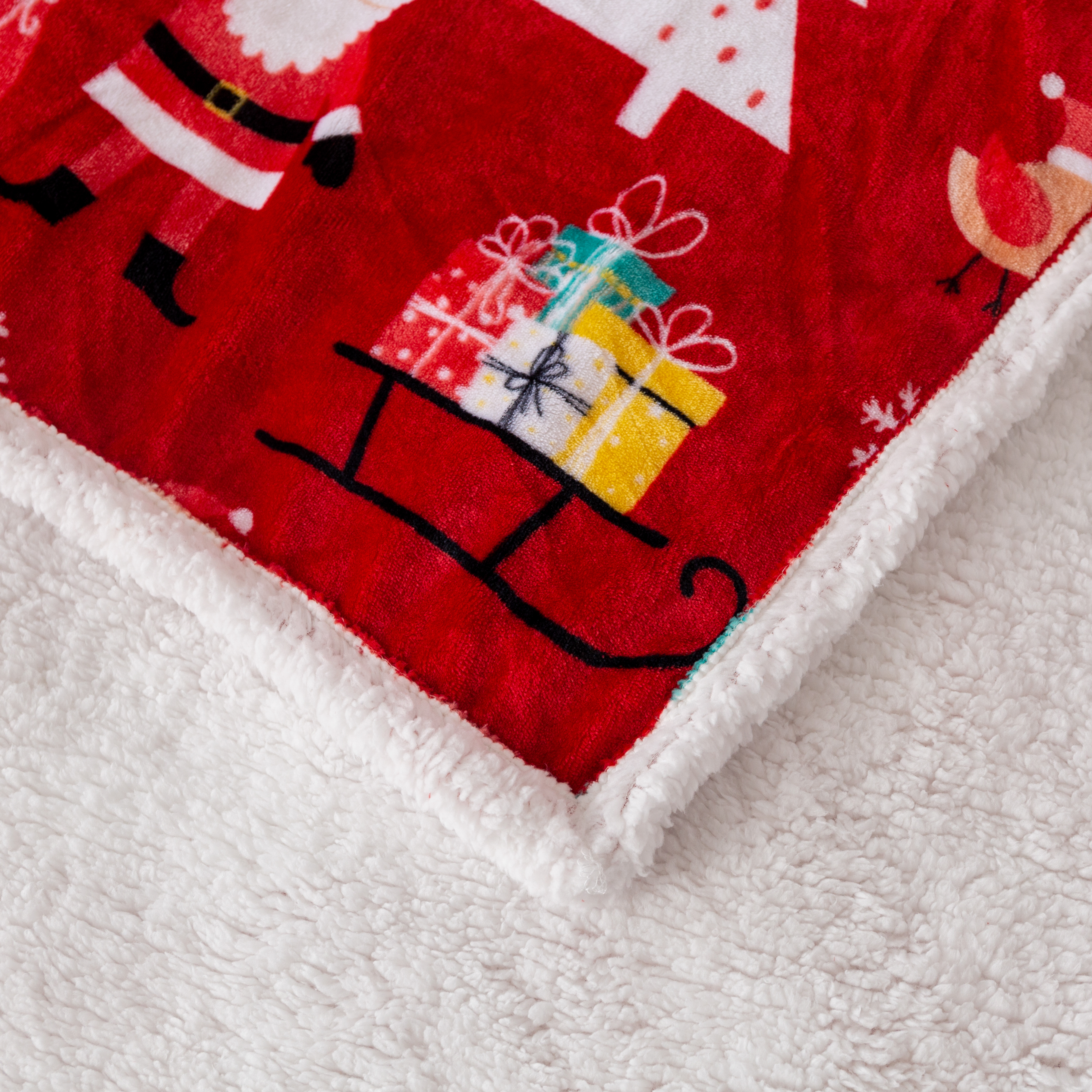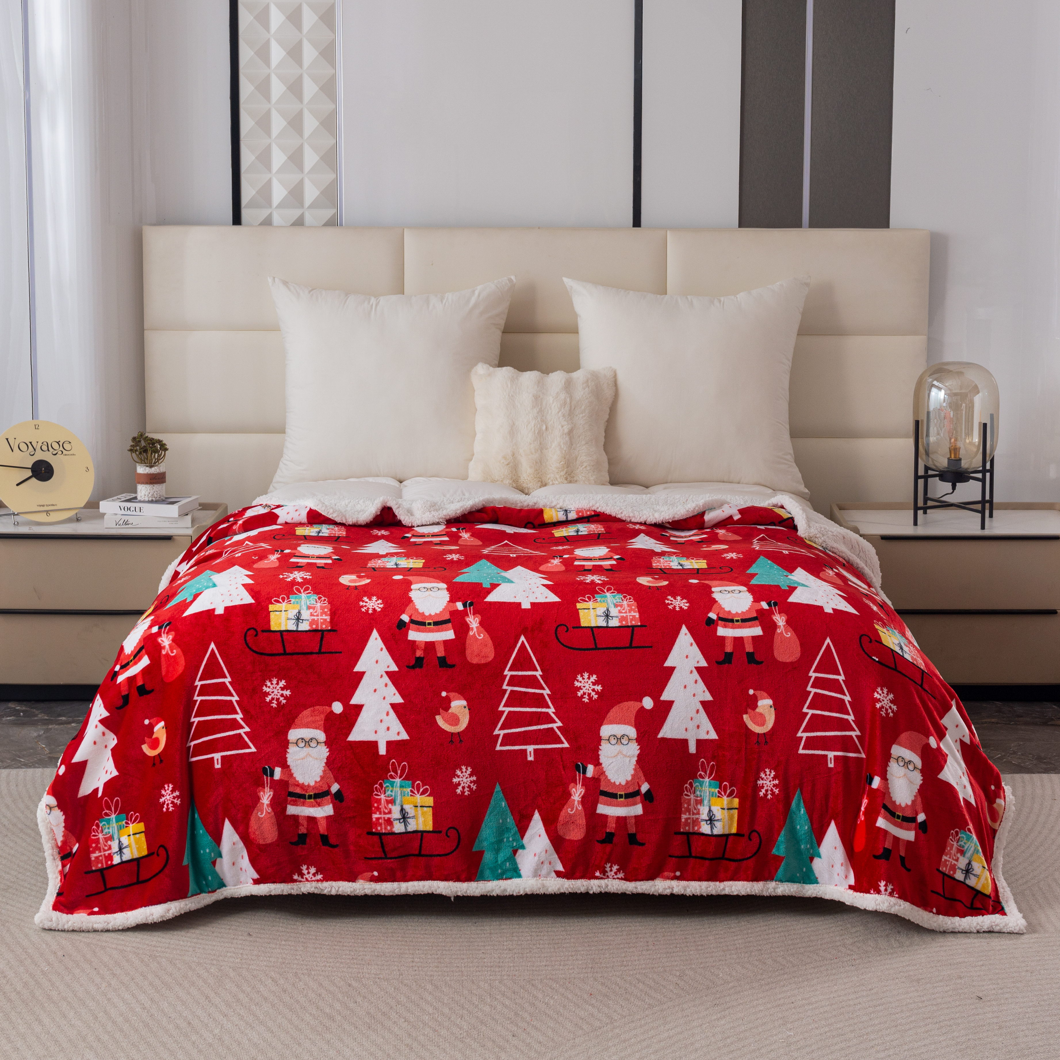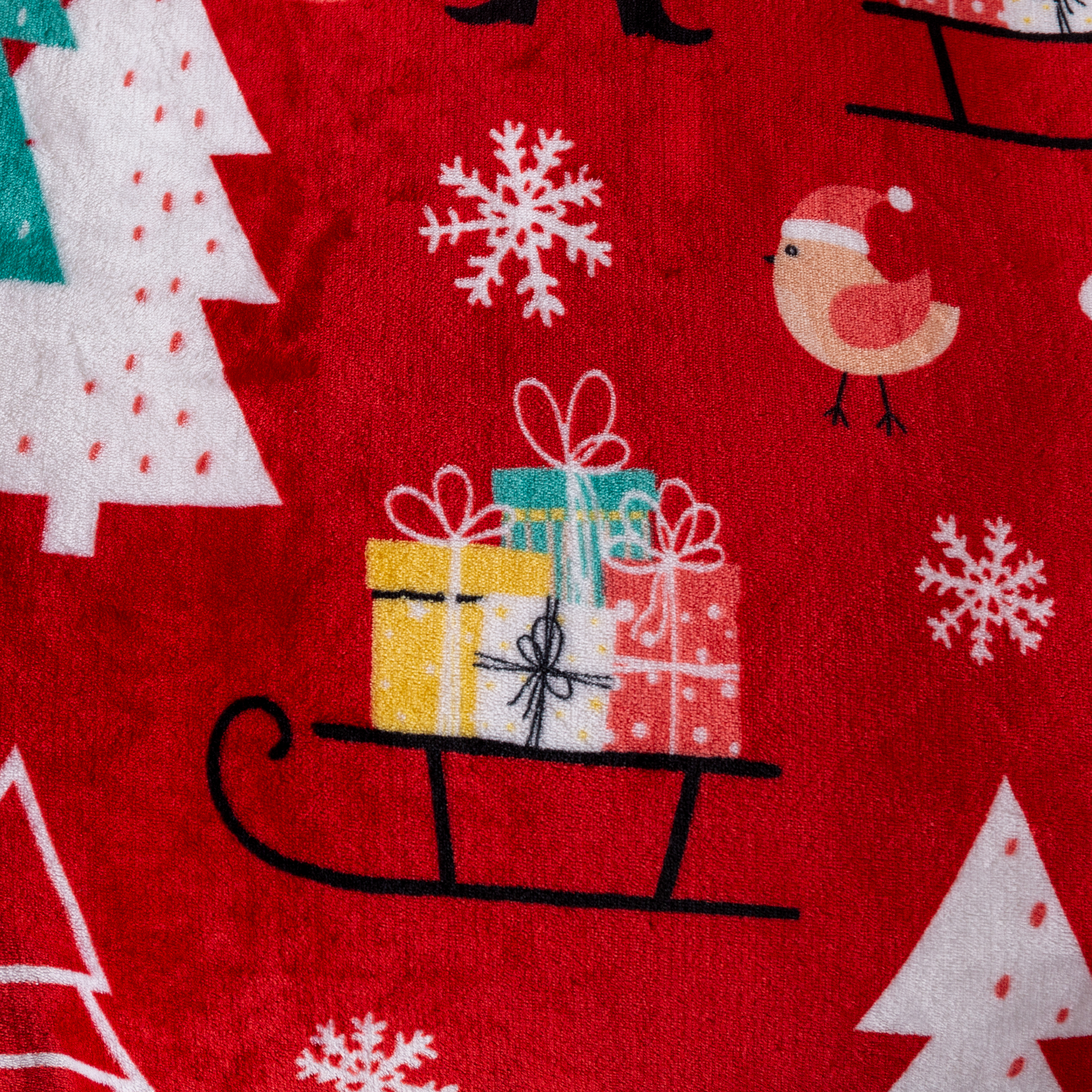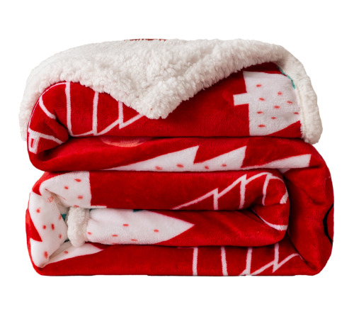Puszysty koc świąteczny 160x200 Choinki Bałwanki Sanie Świąteczne CZERWONY