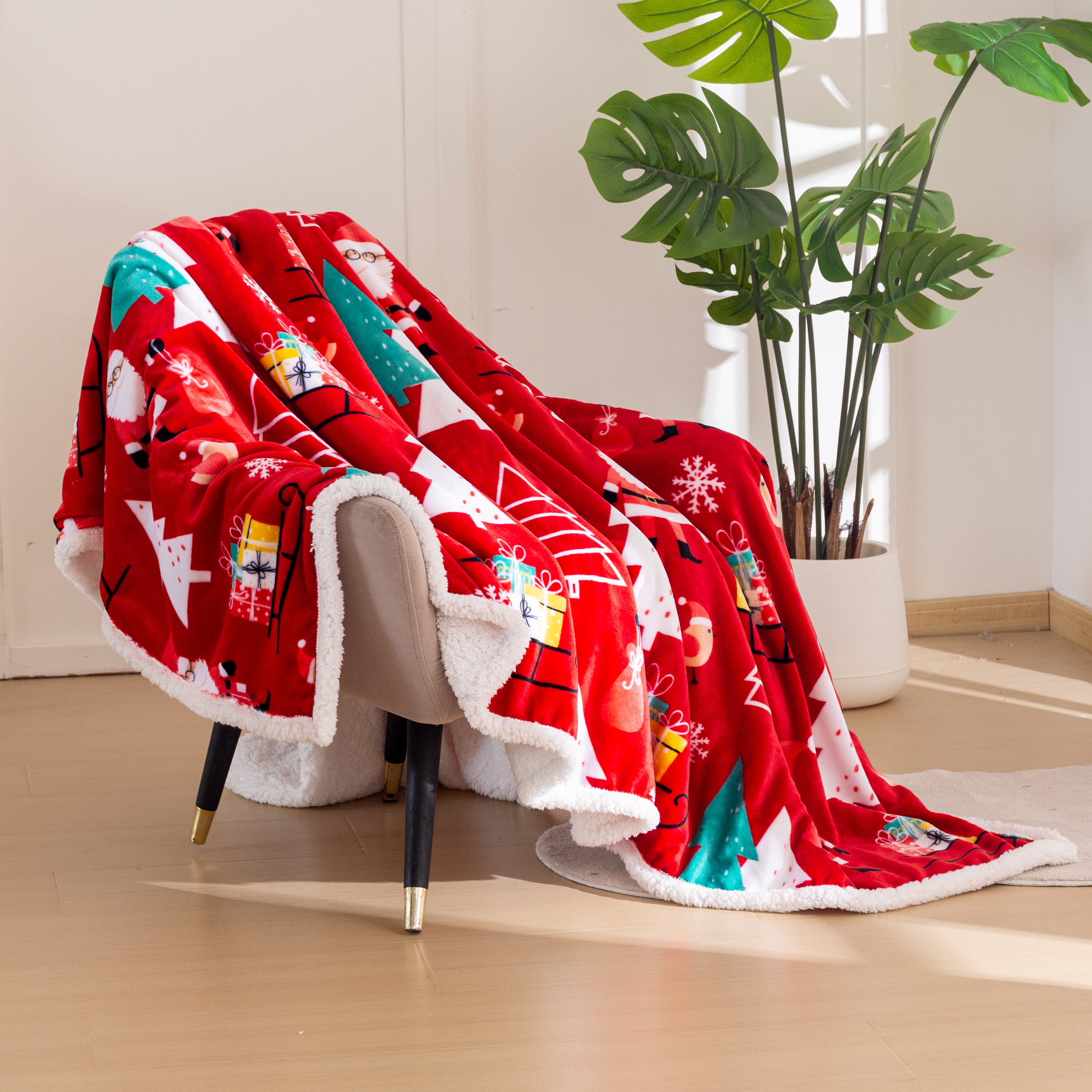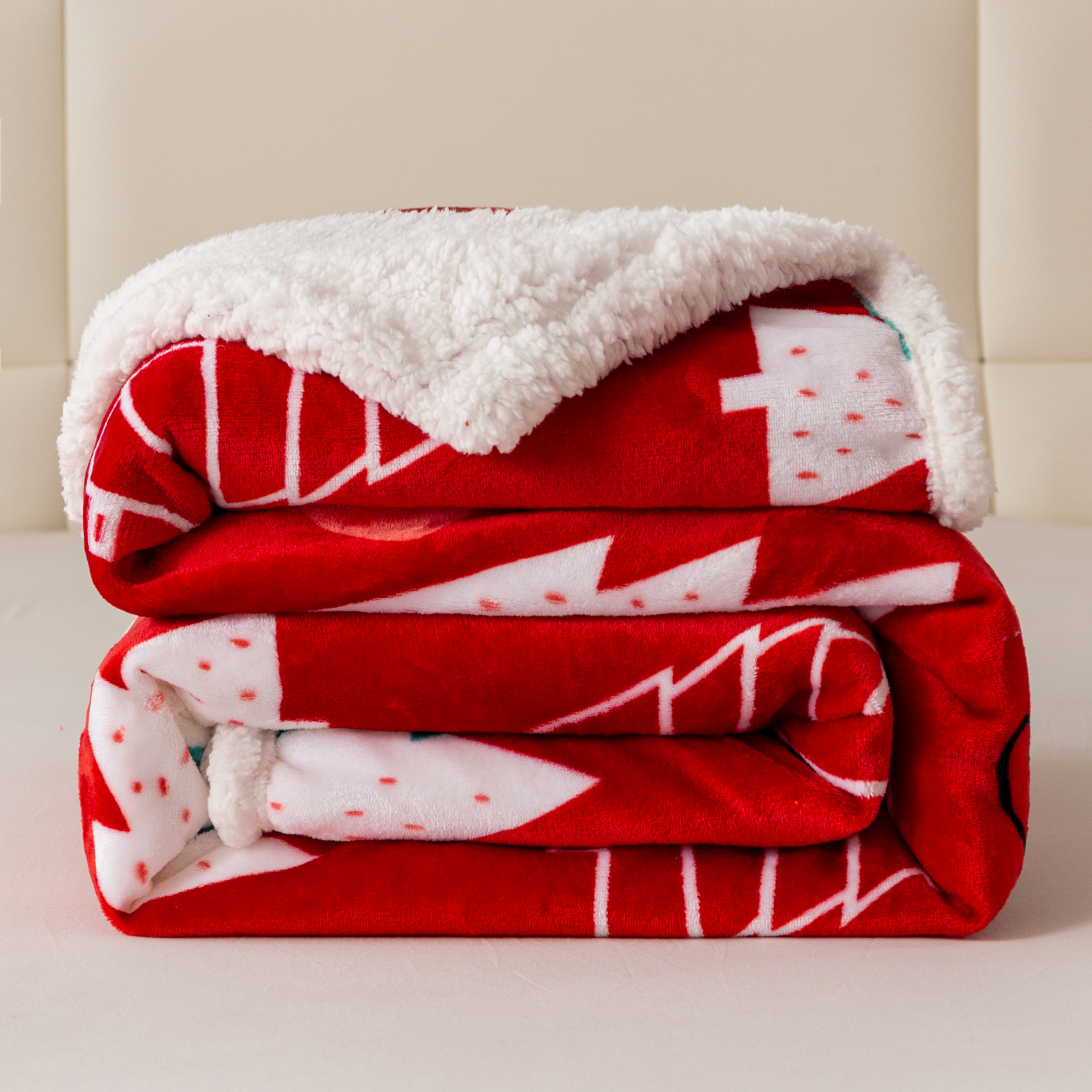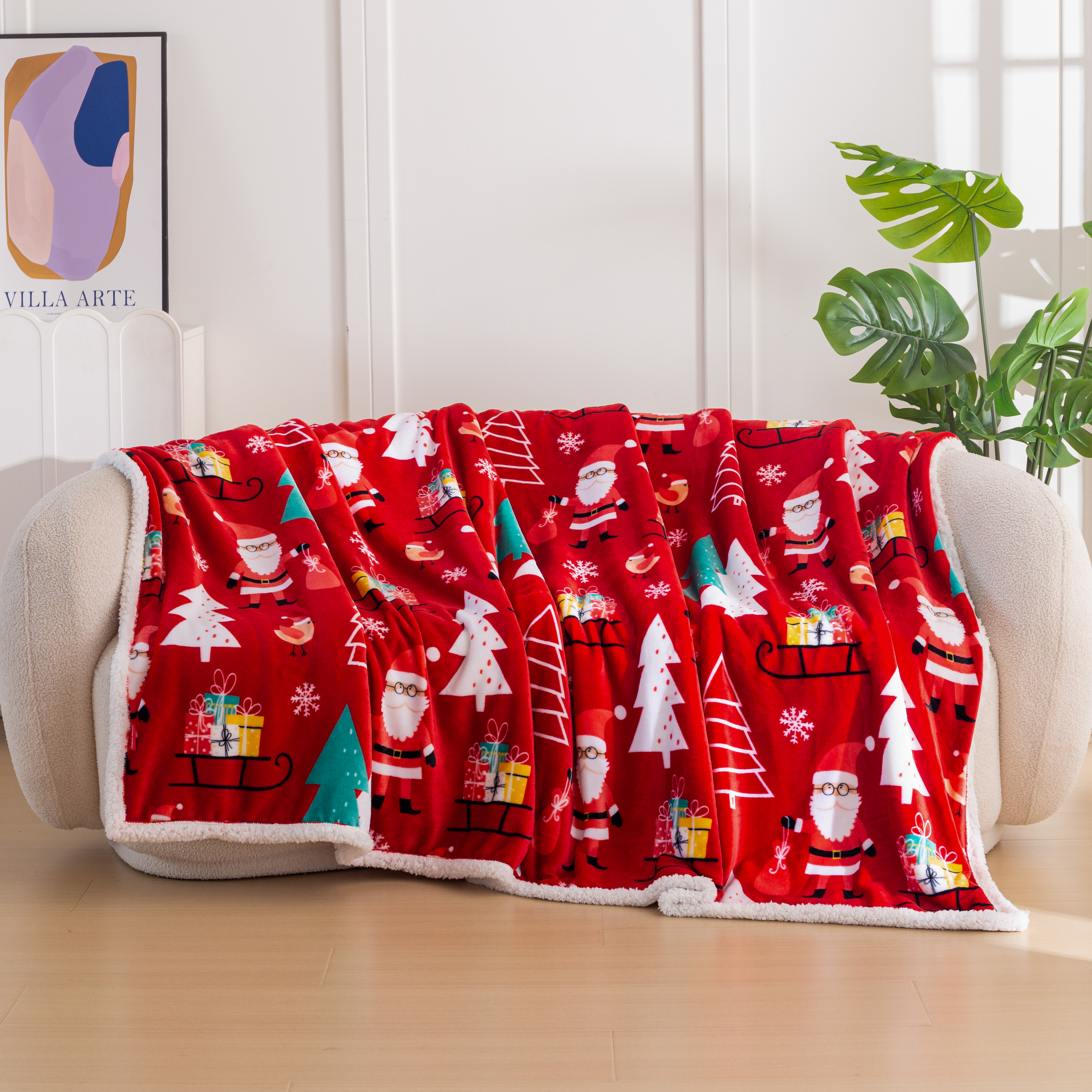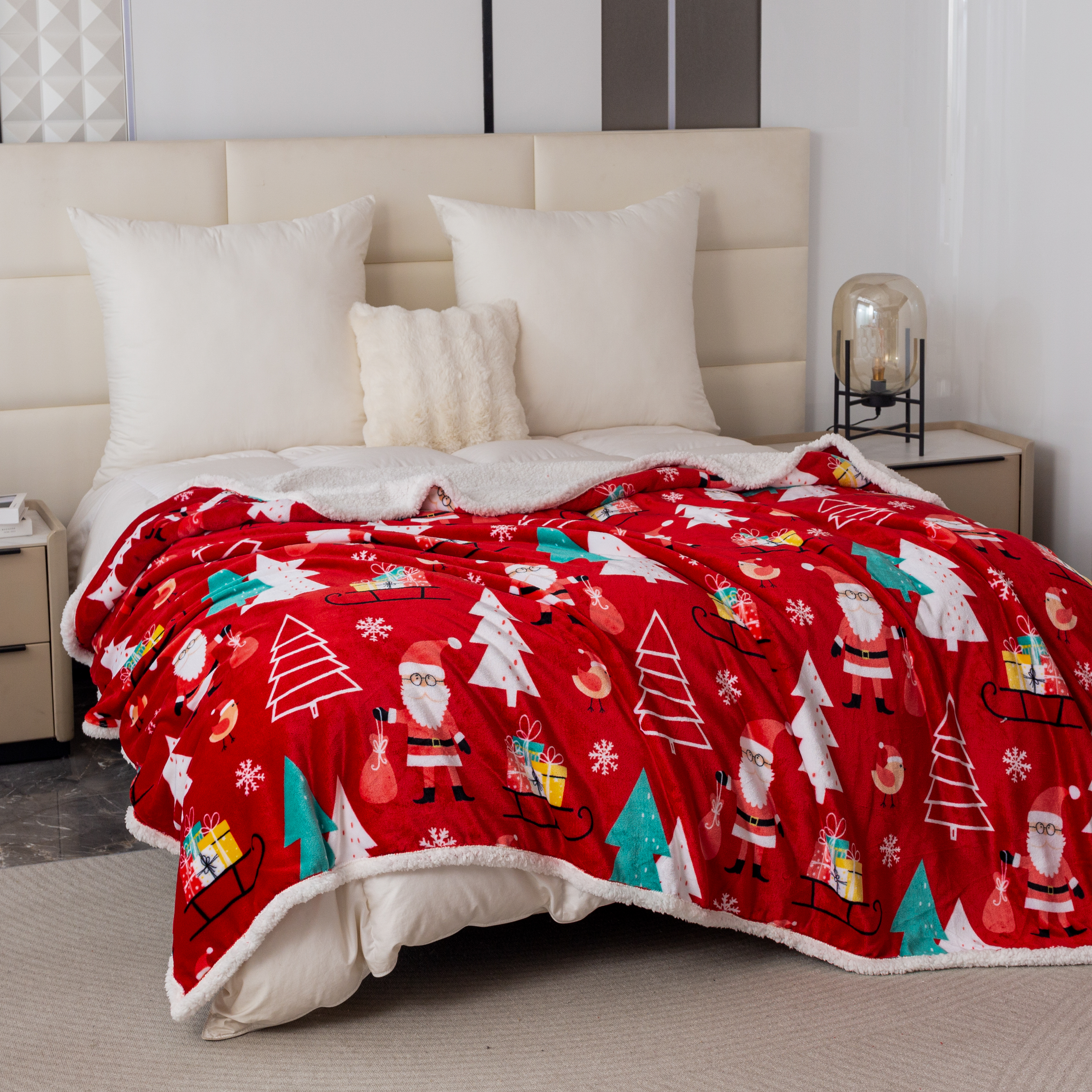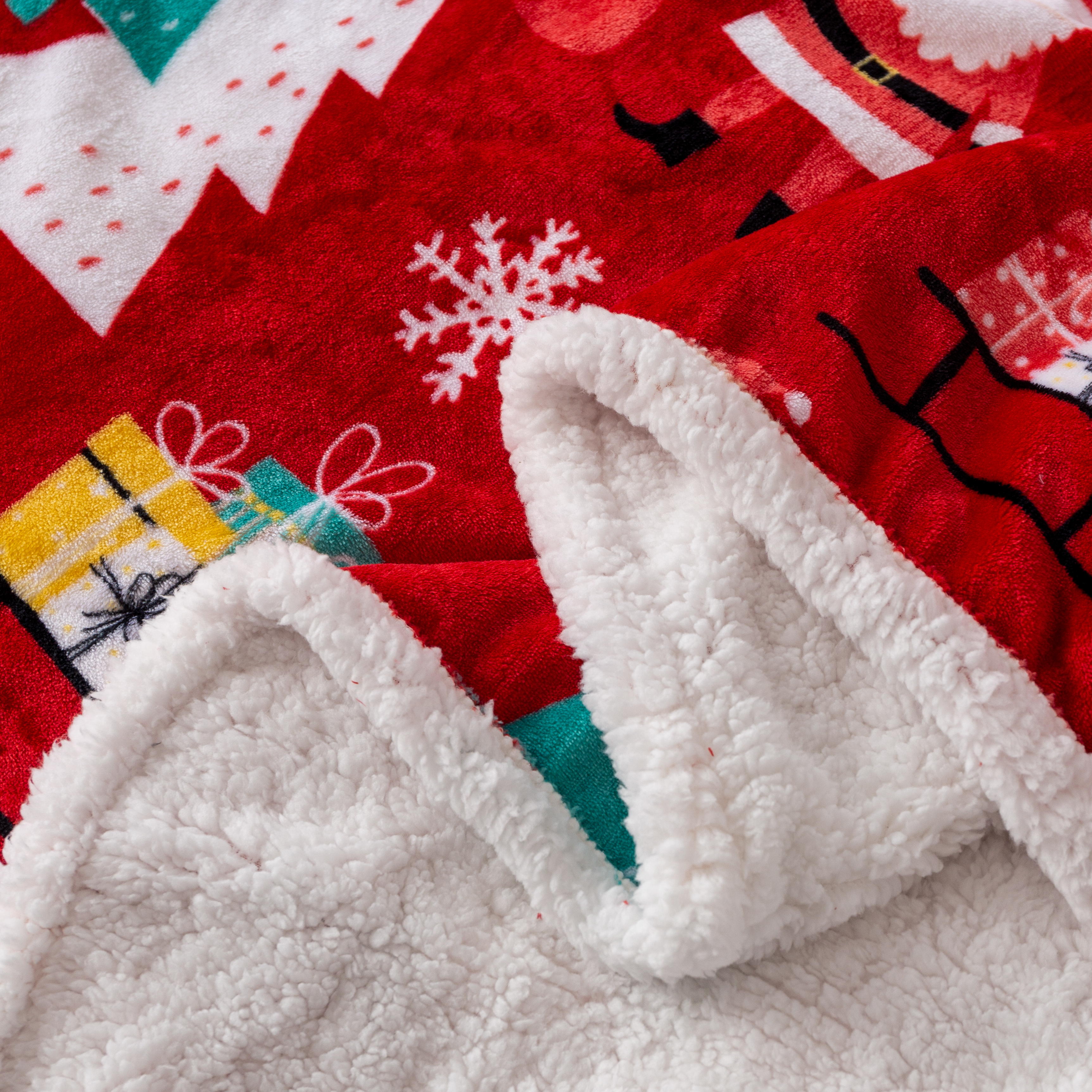 Puszysty koc świąteczny 160x200 Choinki Bałwanki Sanie Świąteczne CZERWONY