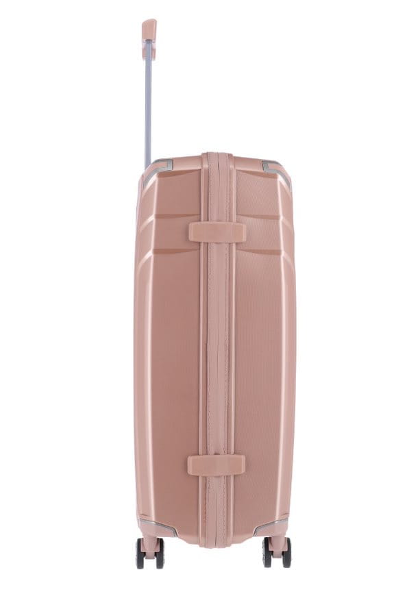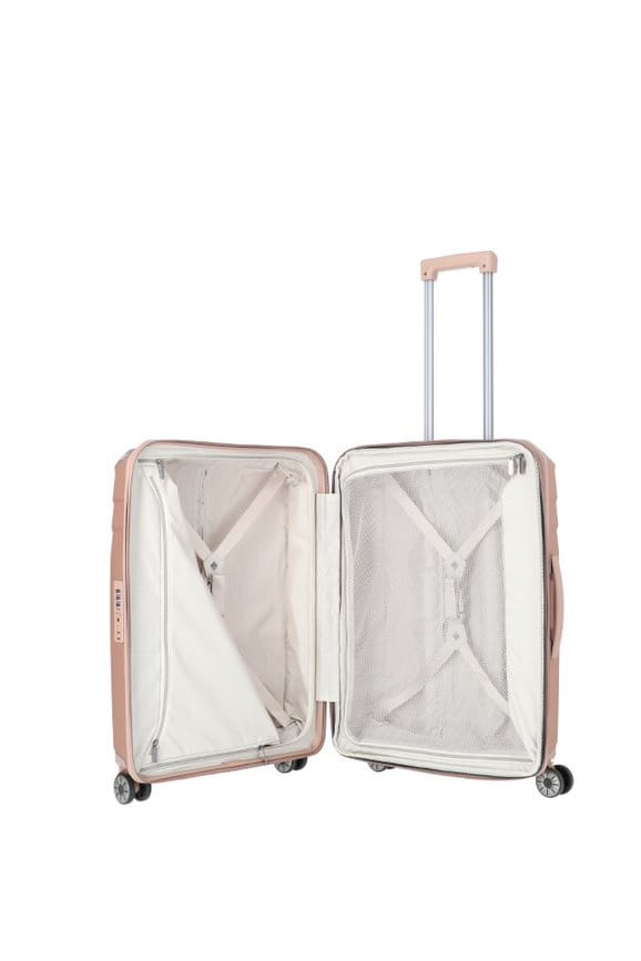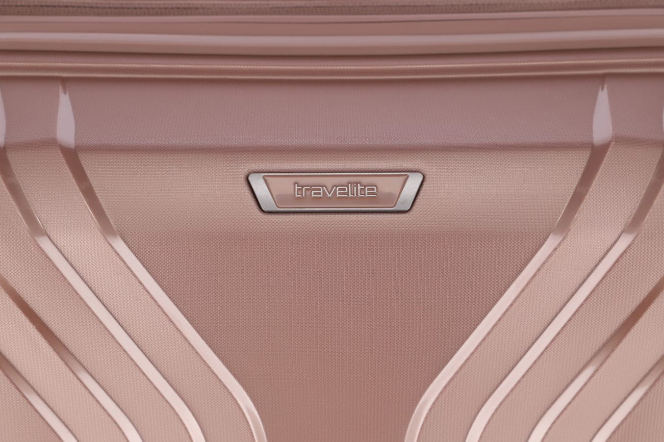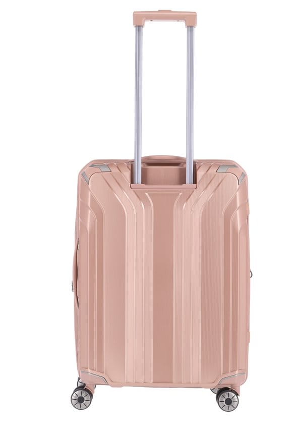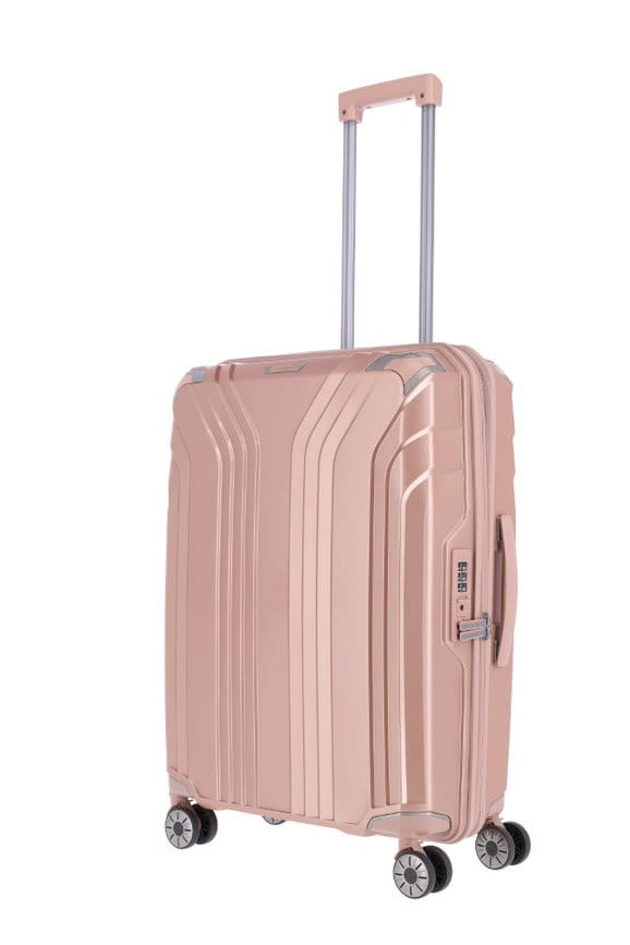 Walizka średnia TRAVELITE 76348.14 z kolekcji ELVAA wykonana została z bardzo wytrzymałego i lekkiego polipropylenu w kolorze różanym/golden rose. Bagaż wyposażony jest w cztery podwójne kółka ciche na każdym podłożu, które ułatwiają prowadzenie bagażu. Wysuwany aluminiowy uchwyt z blokadą oraz uchwyt górny pozwalają na swobodne przenoszenie. Wewnątrz znajduje się przestronna komora z elastycznymi pasami utrzymującymi bagaż, a klapa walizki zamykana jest na zamek. Dzięki funkcjonalnie podzielonemu wnętrzu pakowanie staje się dużo łatwiejsze. Za bezpieczeństwo bagażu podczas podróży odpowiada zamek szyfrowy TSA.