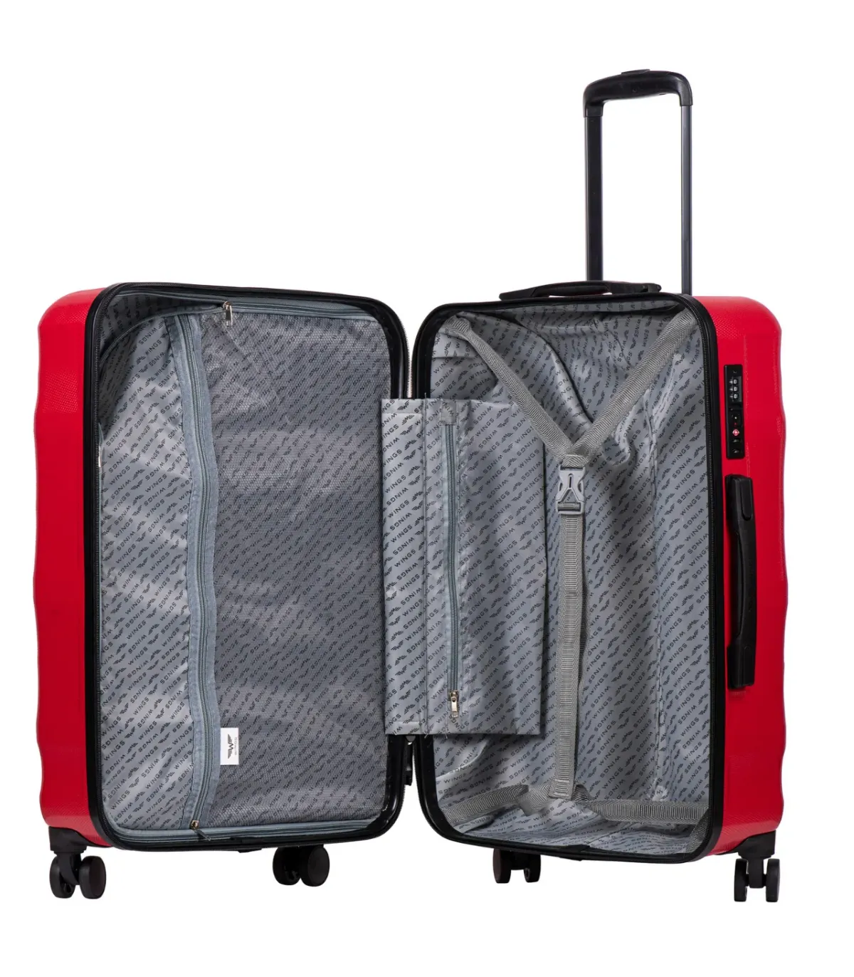 - rozbudowane wnętrze walizki, kontrastowy materiał wewnątrz
