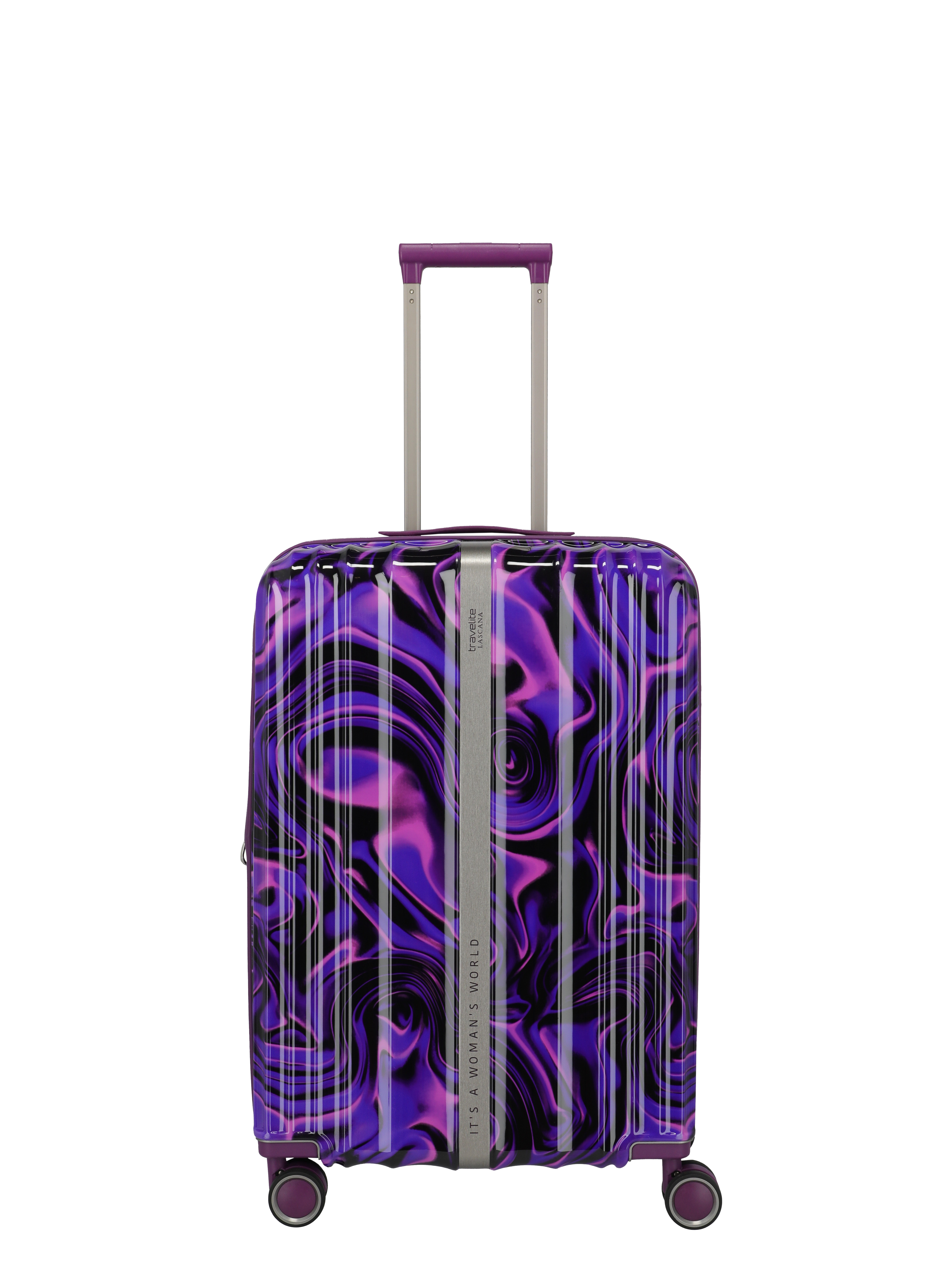 Walizka została wykonana z wytrzymałego materiału ABS o błyszczącym, odpornym na zarysowania wykończeniu. Stylowy efekt swirl w odcieniach fioletu sprawia, że łatwo rozpoznasz ją na taśmie bagażowej.