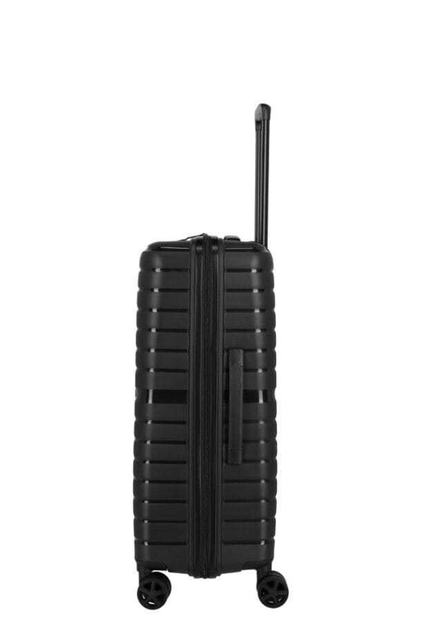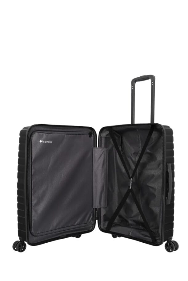 Walizka Średnia TRAVELITE 076540 01 firmy Travelite z kolekcji TRIENT wykonana została z bardzo wytrzymałego i lekkiego materiału polipropylen w kolorze czarnym. Bagaż wyposażony jest w cztery podwójne kółka ciche na każdym podłożu, które ułatwiają prowadzenie bagażu. Wysuwany aluminiowy uchwyt z blokadą oraz uchwyt górny pozwalają na swobodne przenoszenie. Wewnątrz znajduje się przestronna komora z elastycznymi pasami utrzymującymi bagaż, a klapa walizki zamykana jest na zamek. Dzięki funkcjonalnie podzielonemu wnętrzu pakowanie staje się dużo łatwiejsze. Za bezpieczeństwo bagażu podczas podróży odpowiada zamek szyfrowy TSA.