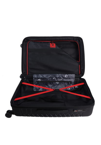 - Wnętrze z pasami zabezpieczającymi i pełną komorą zapinaną na suwak dla optymalnej organizacji i bezpieczeństwa bagażu.
