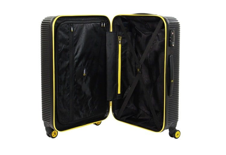 Wnętrze walizki posiada pasy zabezpieczające, które zapobiegają przemieszczaniu się zawartości bagażu oraz pełną, zapinaną na suwak komorę wraz z podszewką klasy premium.
