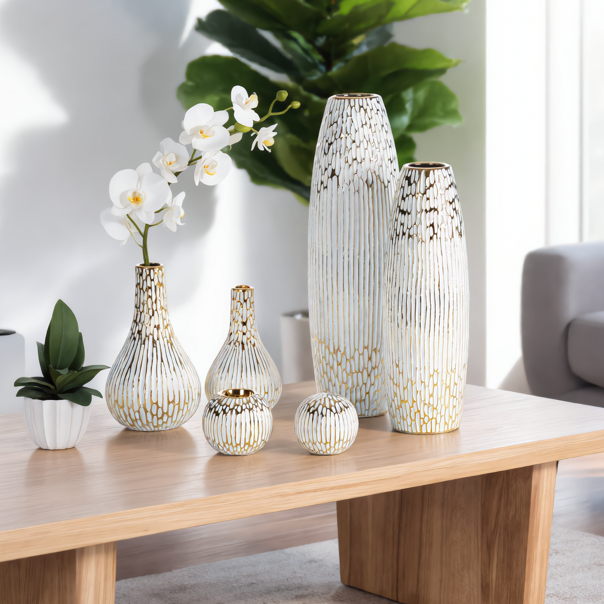 Elegancki wazon dekoracyjny ANDREA to efektowny element dekoracyjny, który doskonale podkreśli charakter nowoczesnych i klasycznych wnętrz. Połączenie ponadczasowej bieli ze złotymi detalami nadaje mu wyjątkowej elegancji i subtelnego blasku, dzięki czemu świetnie prezentuje się jako centralna ozdoba pomieszczenia.